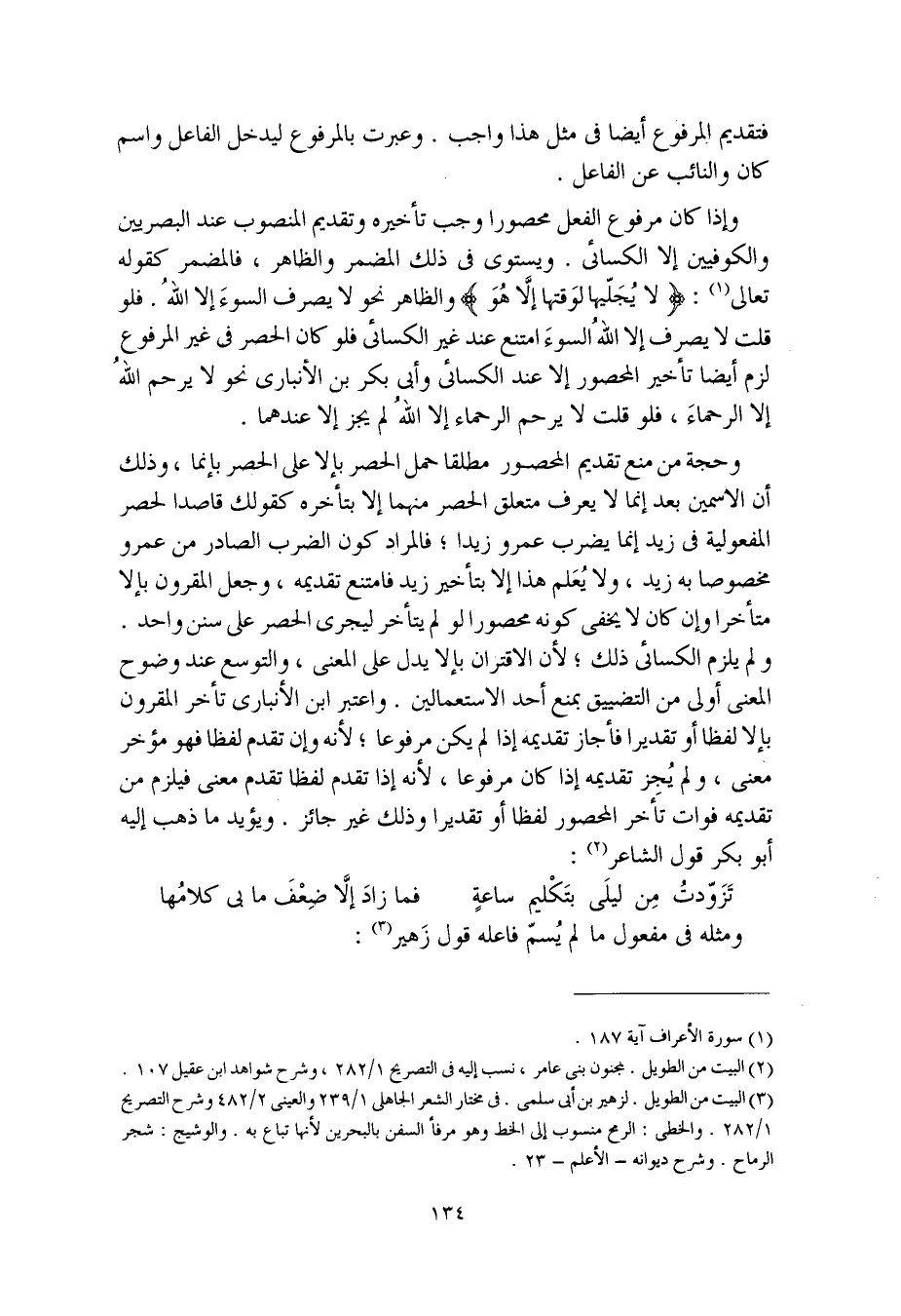وإذا كان مرفوع الفعل محصورا وجب تأخيره وتقديم المنصوب عند البصريين والكوفيين إلا الكسائي. ويستوي في ذلك المضمر والظاهر، فالمضمر كقوله تعالى: (لا يُجَلِّيها لوقتها إلا هو) والظاهر نحو لا يصرف السوءَ إلا اللهُ. فلو قلت لا يصرف إلا اللهُ السوءَ امتنع عند غير الكسائي فلو كان الحصر في غير المرفوع لزم أيضا تأخير المحصور إلا عند الكسائي وأبي بكر بن الأنباري نحو لا يرحم اللهُ إلا الرحماءَ، فلو قلت لا يرحم الرحماء إلا اللهُ لم يجز إلا عندهما.
