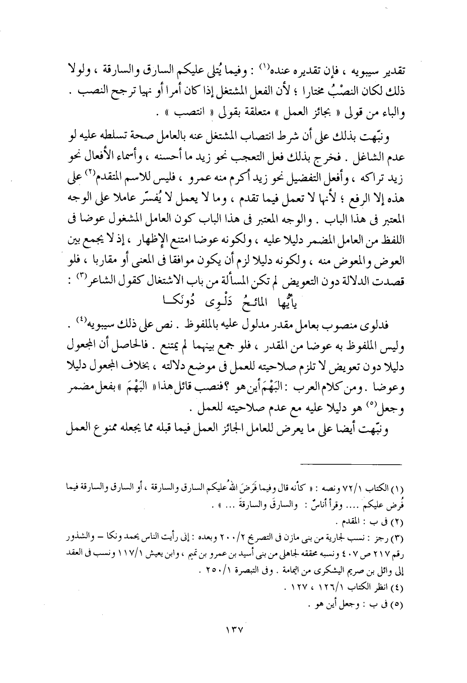 وليس الملفوظ به عوضا من المقدر، فلو جمع بينهما لم يمتنع، فالحاصل أن المجعول دليلا دون تعويض لا تلزم صلاحيته للعمل في موضع دلالته، بخلاف المجعول دليلا وعوضا. ومن كلام العرب: البَهْمَ أين هو؟ فنصب قائل هذا "البَهْمَ" بفعل مضمر وجعل هو دليلا عليه مع عدم صلاحيته للعمل.