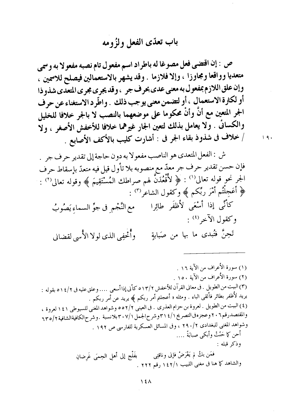 ص: إن اقتضى فعل مصوغا له باطراد اسم مفعول تام نصبه مفعولا به وسمي متعديا وواقعا ومجاوزا، وإلا فلازما. وقد يشهر بالاستعمالين فيصلح للاسمين، وإن علق اللازم بمفعول به معنى عدي بحر فجر، وقد يجرى مجرى المتعدي شذوذا أو لكثرة الاستعمال، أو لتضمن معنى يوجب ذلك. واطّرد الاستغناء عن حرف الجر المتعين مع أنَّ وأنْ محكوما على موضعهما بالنصب لا بالجر خلافا للخليل والكسائي. ولا يعامل بذلك لتعين الجار غيرهما خلافا للأخفش الأصغر، ولا خلاف في شذوذ بقاء الجر في: أشارت كليب بالأكف الأصابع.