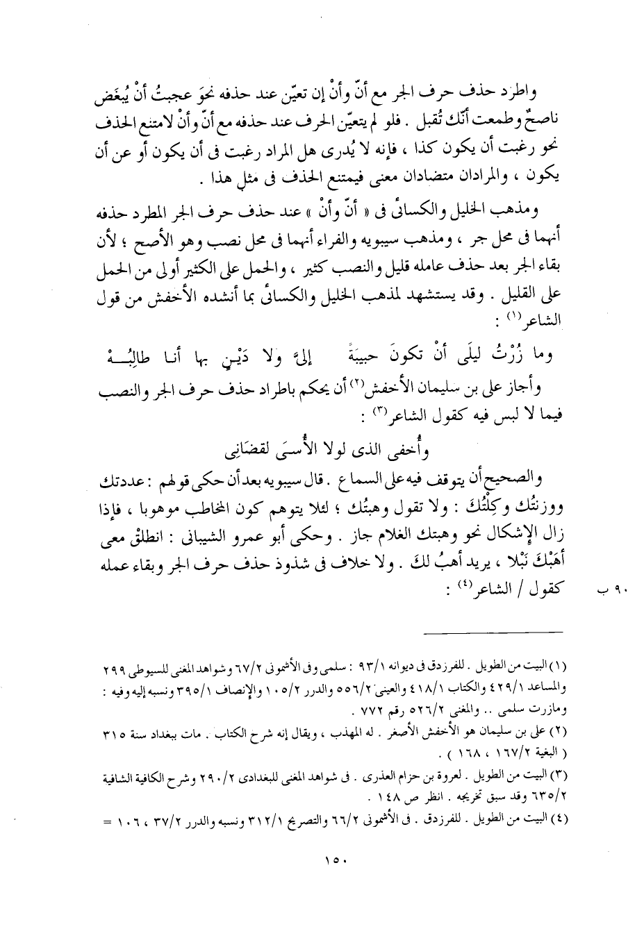ومذهب الخليل والكسائي في "أنّ وأنْ" عند حذف حرف الجر المطرد حذفه أنهما في محل جر، ومذهب سيبويه والفراء أنهما في محل نصب وهو الأصح، لأن بقاء الجر بعد حذف عامله قليل والنصب كثير، والحمل على الكثير أولى من الحمل على القليل. وقد يستشهد لمذهب الخليل والكسائي بما أنشده الأخفش من قول الشاعر: