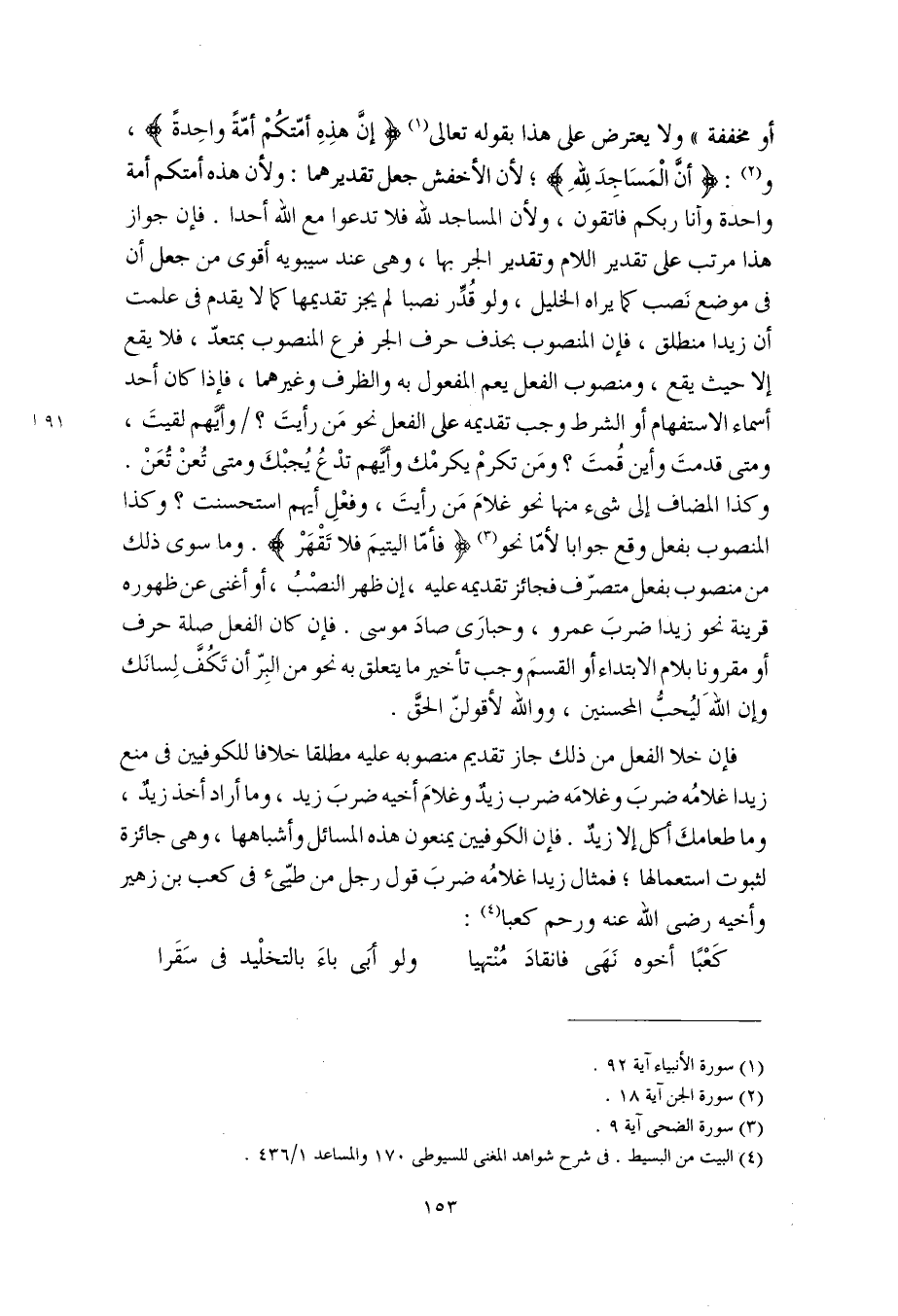 أو مخففة" ولا يعترض على هذا بقوله تعالى (إنَّ هذه أمّتكم أمةً واحدةً)، و: (أنَّ المساجد لله)، لأن الأخفش جعل تقديرهما: ولأن هذه أمتكم أمة واحدة وأنا ربكم فاتقون، ولأن المساجد لله فلا تدعوا مع الله أحدا. فإن جواز هذا مرتب على تقدير اللام وتقدير الجر بها، وهي عند سيبويه أقوى من جعل أن في موضع نصب كما يراه الخليل، ولو قُدِّر نصبا لم يجز تقديمها كما لا يقدم في علمت أن زيدا منطلق، فإن المنصوب بحذف حرف الجر فرع المنصوب بمتعدّ، فلا يقع إلا حيث يقع، ومنصوب الفعل يعم المفعول به والظرف وغيرهما، فإذا كان أحد أسماء الاستفهام أو الشرط وجب تقديمه على الفعل نحو مَن رأيتَ؟ وأيَّهم لقيتَ، ومتى قدمتَ وأين قُمتَ؟ ومَن تكرمْ يكرمْك وأيَّهم تدْعُ يُجبْكَ ومتى تُعنْ تُعَنْ. وكذا المضاف إلى شيء منها نحو غلامَ من رأيتَ، وفعْلِ أيهم استحسنت؟ وكذا المنصوب بفعل وقع جوابا لأمّا نحو (فأمّا اليتيمَ فلا تقهرْ). وما سوى ذلك من منصوب بفعل متصرّف فجائز تقديمه عليه، إن ظهر النصبُ، أو أغنى عن ظهوره قرينة نحو زيدا ضرب عمرو، وحبارى صاد موسى. فإن كان الفعل صلة حرف أو مقرونا بلام الابتداء أو القسم وجب تأخير ما يتعلق به نحو من البِرّ أن تكُفَّ لسانَك وإن اللهَ ليُحبُّ المحسنين، ووالله لأقولنّ الحقَّ.