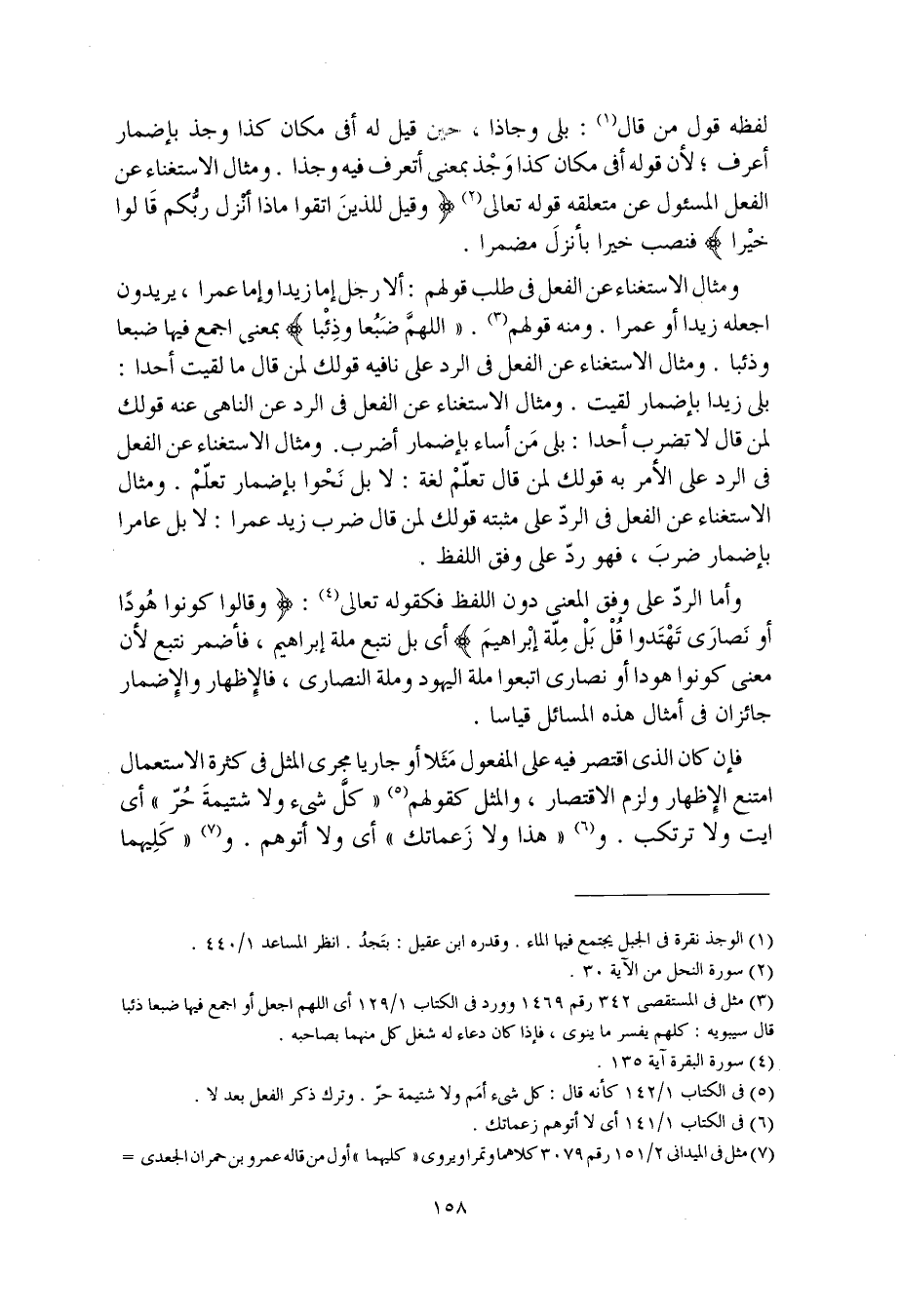 ومثال الاستغناء عن الفعل في طلب قولهم: ألا رجل إما زيدا وإما عمرا، يريدون اجعله زيدا أو عمرا. ومنه قولهم: "اللهمَّ ضَبُعا وذِئْبا" بمعنى اجمع فيها ضبعا وذئبا. ومثال الاستغناء عن الفعل في الرد على نافيه قولك لمن قال ما لقيت أحدا: بلى زيدا بإضمار لقيت. ومثال الاستغناء عن الفعل في الرد عن الناهي عنه قولك لمن قال لا تضرب أحدا: بلى من أساء بإضمار أضرب. ومثال الاستغناء عن الفعل في الرد على الأمر به قولك لمن قال تعلّمْ لغة: لا بل نَحْوا بإضمار تعلّمْ. ومثال الاستغناء عن الفعل في الردّ على مثبته قولك لمن قال ضرب زيد عمرا: لا بل عامرا بإضمار ضربَ، فهو ردّ على وفق اللفظ.