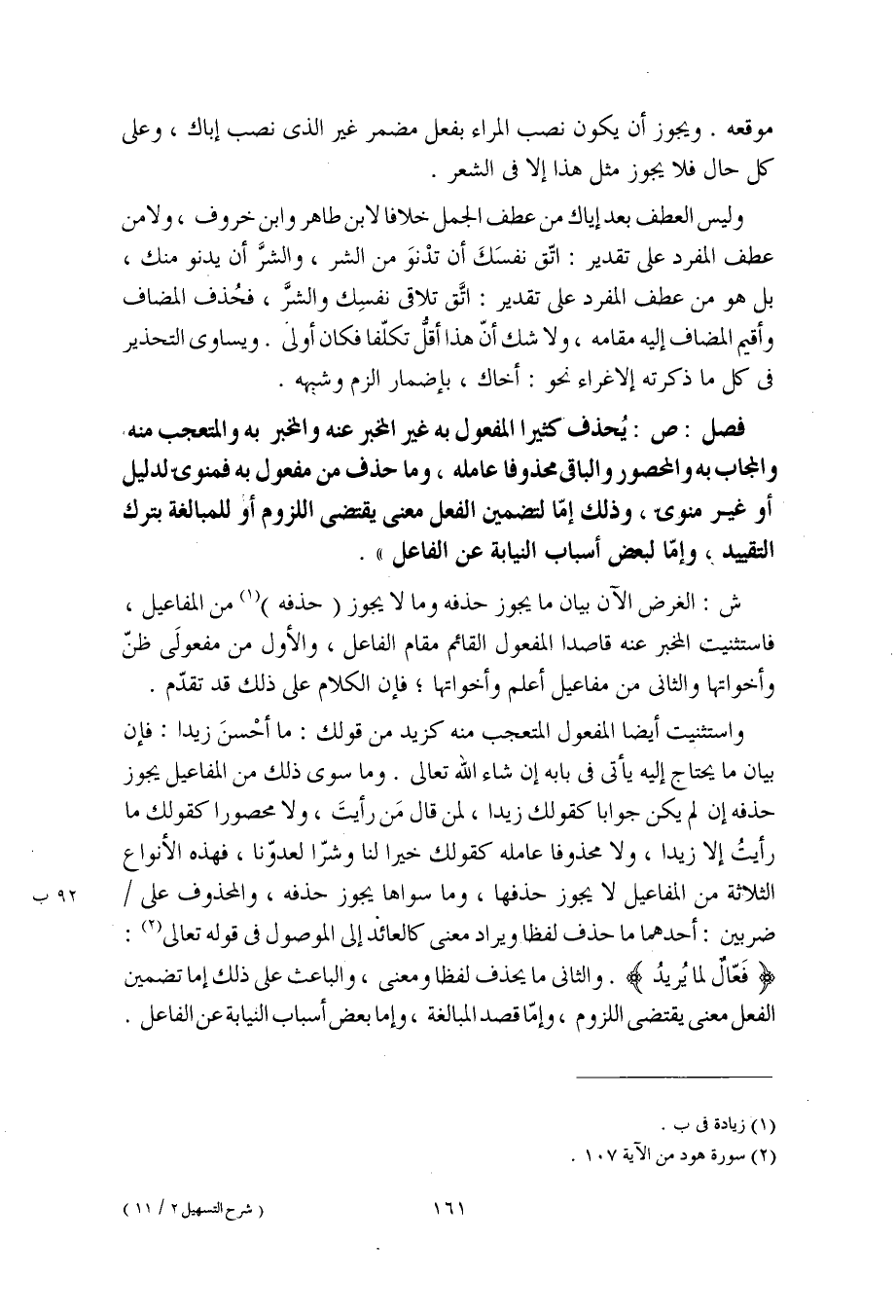 واستثنيت أيضا المفعول المتعجب منه كزيد من قولك: ما أحْسنَ زيدا: فإن بيان ما يحتاج إليه يأتي في بابه إن شاء الله تعالى. وما سوى ذلك من المفاعيل يجوز حذفه إن لم يكن جوابا كقولك زيدا، لمن قال مَن رأيتَ، ولا محصورا كقولك ما رأيتُ إلا زيدا، ولا محذوفا عامله كقولك خيرا لنا وشرّا لعدوّنا، فهذه الأنواع الثلاثة من المفاعيل لا يجوز حذفها، وما سواها يجوز حذفه، والمحذوف على ضربين: أحدهما ما حذف لفظا ويراد معنى كالعائد إلى الموصول في قوله تعالى: (فَعّالٌ لما يريد). والثاني ما يحذف لفظا ومعنى، والباعث على ذلك إما تضمين الفعل معنى يقتضي اللزوم، وإمّا قصد المبالغة، وإما بعض أسباب النيابة عن الفاعل.