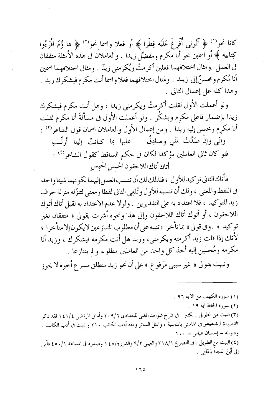 ولو أعملت الأول لقلت أكرمتُ ويكرمني زيدا، وهل أنت مكرم فيشكرك زيدا بإضمار فاعلي مكرِم ويشكُر. ولو أعملت الأول في مسألة أنا مكرم لقلت أنا مكرِم ومحسن إليه زيدا. ومن إعمال الأول والعاملان اسمان قول الشاعر: