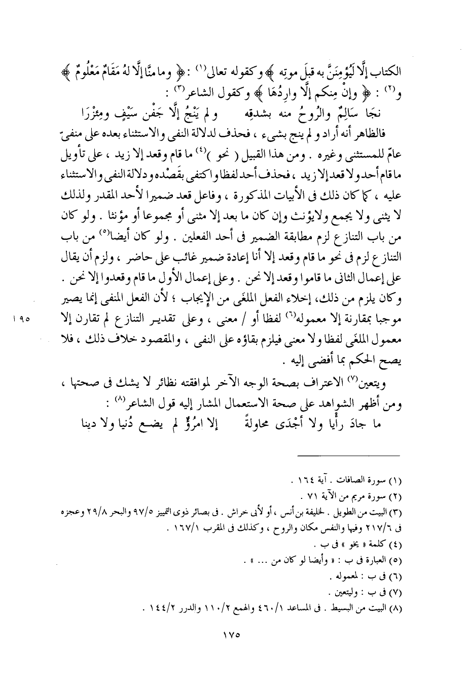 الكتاب إلّا لَيُؤمِنَنَّ به قبل موته) وكقوله تعالى: (وما منّا إلّا له مقامٌ معلومٌ) و: (وإنْ منكم إلّا ورادُها) وكقول الشاعر: