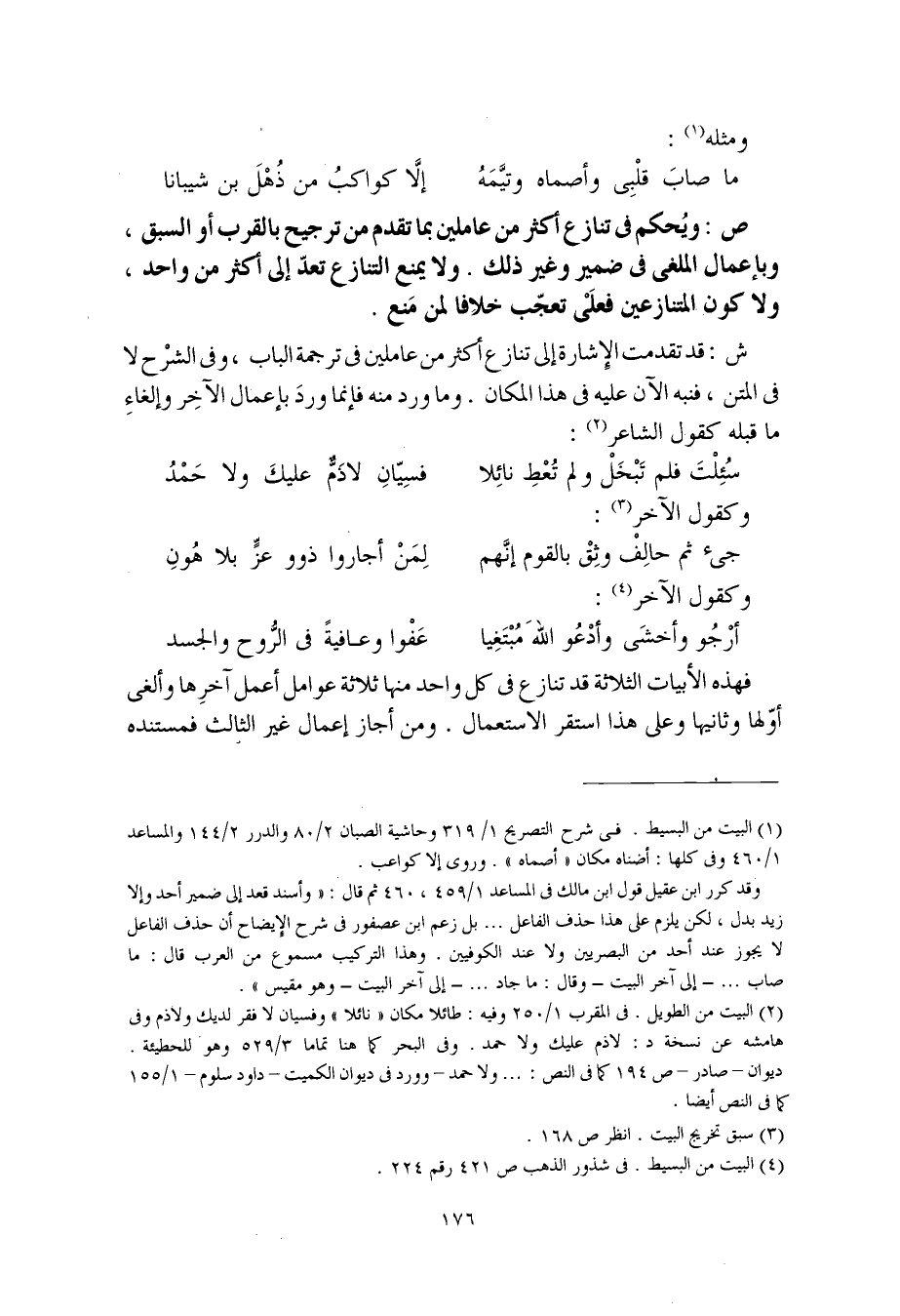 فهذه الأبيات الثلاثة قد تنازع في كل واحد منها ثلاثة عوامل أعمل آخرها وألغى أوّلها وثانيها وعلى هذا استقر الاستعمال. ومن أجاز إعمال غير الثالث فمستنده