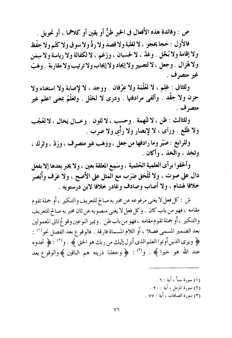 فالأول: حَجا يحجو، لا لغَلَبة ولا قصد ولا ردٍّ ولا سوق ولولا كتْم ولا حِفْظ ولا إقامة ولا بُخْل. وعدَّ، لا لحسبان، وزَعَم، لا لكفالة ولا رياسة ولا سِمَن ولا هُزال. وجعل، لا لتصيير ولا إيجاد ولا إيجاب ولا ترتيب ولا مقاربة. وهَبْ غير متصرف.
