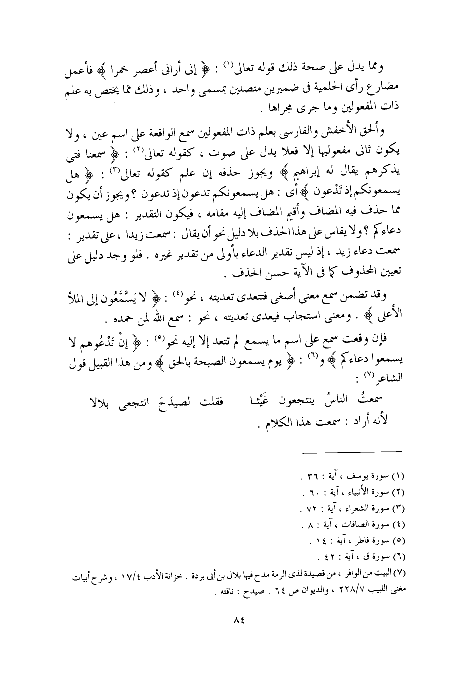 فإن وقعت سمع على اسم ما يسمع لم تتعد إلا إليه نحو: (إنْ تدعُوهم لا يسمعوا دعاءكم) و: (يوم يسمعون الصيحة بالحق) ومن هذا القبيل قول الشاعر:
