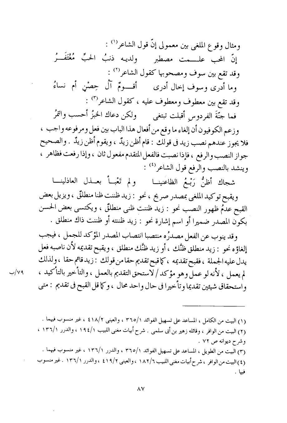 وزعم الكوفيون أن إلغاء ما وقع من أفعال هذا الباب بين فعل ومرفوعه واجب، فلا يجوز عندهم نصب زيد في قولك: قام أظن زيدٌ، ويقوم أظن زيدٌ. والصحيح جواز النصب والرفع، فإذا نصبت فالفعل المتقدم مفعول ثان، وإذا رفعت فظاهر، وينشد بالنصب والرفع قول الشاعر: