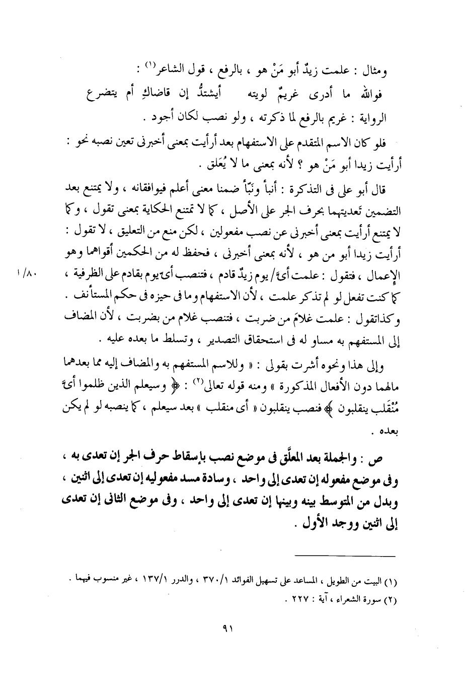 وإلى هذا ونحوه أشرت بقولي: "وللاسم المستفهم به والمضاف إليه مما بعدهما ما لهما دون الأفعال المذكورة" ومنه قوله تعالى: (وسيعلم الذين ظلموا أيَّ منقلب ينقلبون) فنصب ينقلبون "أي منقلب" بعد سيعلم، كما ينصبه لو لم يكن بعده.