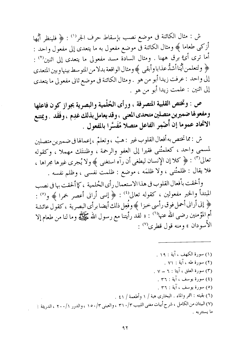 ش: مما تختص به أفعال القلوب غير: هبْ، وتعلمْ، إعمالها في ضميرين متصلين لمسمى واحد، كعلمتُني فقيرا إلى العفو والرحمة، وظننتك مهملا، وكقوله تعالى: (كلا إن الإنسان ليطغى أن رآه استغنى) ولا يُجرى غيرها مجراها، فلا يقال: ظلمتُني، ولا ظلمَه، موضع: ظلمت نفسي، وظلم نفسه.