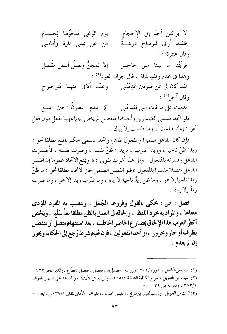 فإن كان الفاعل ضميرا والمفعول ظاهرا واتحد المسمى حكم بالمنع مطلقا نحو: زيدا ظنّ ناجيا، وزيدا ضرب، تريد: ظنَّ نفسه، وضرب نفسه، فأضمرت الفاعل وفسرته بالمفعول. وإلى هذا أشرت بقولي: "ويمنع الاتحاد عموما إن أضمر الفاعل متصلا مفسرا بالمفعول" فلو انفصل الضمير جاز الاتحاد مطلقا نحو: ما ظنَّ زيدا ناجيا إلا هو، وما ظن زيدٌ ناجيا إلا إياه، وما ضَرَب زيدا إلا هو، وما ضرب زيدٌ إلا إياه.