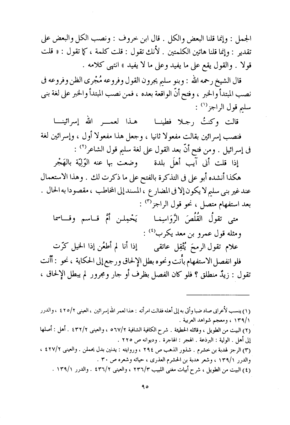 قال الشيخ رحمه الله: وبنو سليم يجرون القول وفروعه مُجْرى الظن وفروعه في نصب المبتدأ والخبر، وفتح أنّ الواقعة بعده، فمن نصب المبتدأ والخبر على لغة بني سليم قول الراجز: