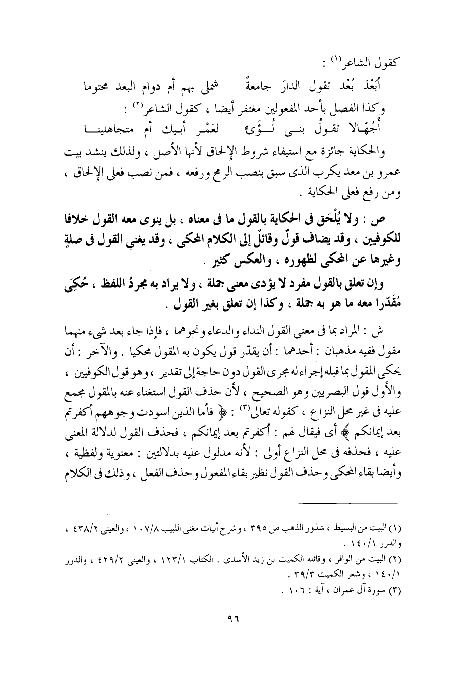 ش: المراد بما في معنى القول النداء والدعاء ونحوهما، فإذا جاء بعد شيء منهما مقول ففيه مذهبان: أحدهما: أن يقدّر قول يكون به المقول محكيا. والآخر: أن يحكى المقول بما قبله إجراء له مجرى القول دون حاجة إلى تقدير، وهو قول الكوفيين، والأول قول البصريين وهو الصحيح، لأن حذف القول استغناء عنه بالمقول مجمع عليه في غير محل النزاع، كقوله تعالى: (فأما الذين اسودت وجوههم أكفرتم بعد إيمانكم) أي فيقال لهم: أكفرتم بعد إيمانكم، فحذف القول لدلالة المعنى عليه، فحذفه في محل النزاع أولى: لأنه مدلول عليه بدلالتين: معنوية ولفظية، وأيضا بقاء المحكي وحذف القول نظير بقاء المفعول وحذف الفعل، وذلك في الكلام