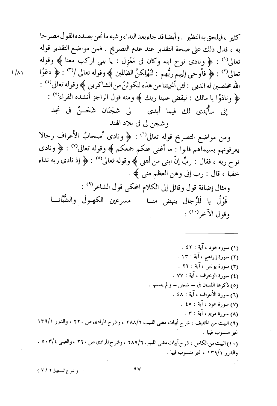 ومن مواضع التصريح قوله تعالى: (ونادى أصحابُ الأعراف رجالا يعرفونهم بسيماهم قالوا: ما أغنى عنكم جمعكم) وقوله تعالى: (ونادى نوح ربه، فقال: ربِّ انّ ابني من أهلي) وقوله تعالى: (إذ نادى ربه نداء خفيا، قال: رب إني وهن العظم مني).