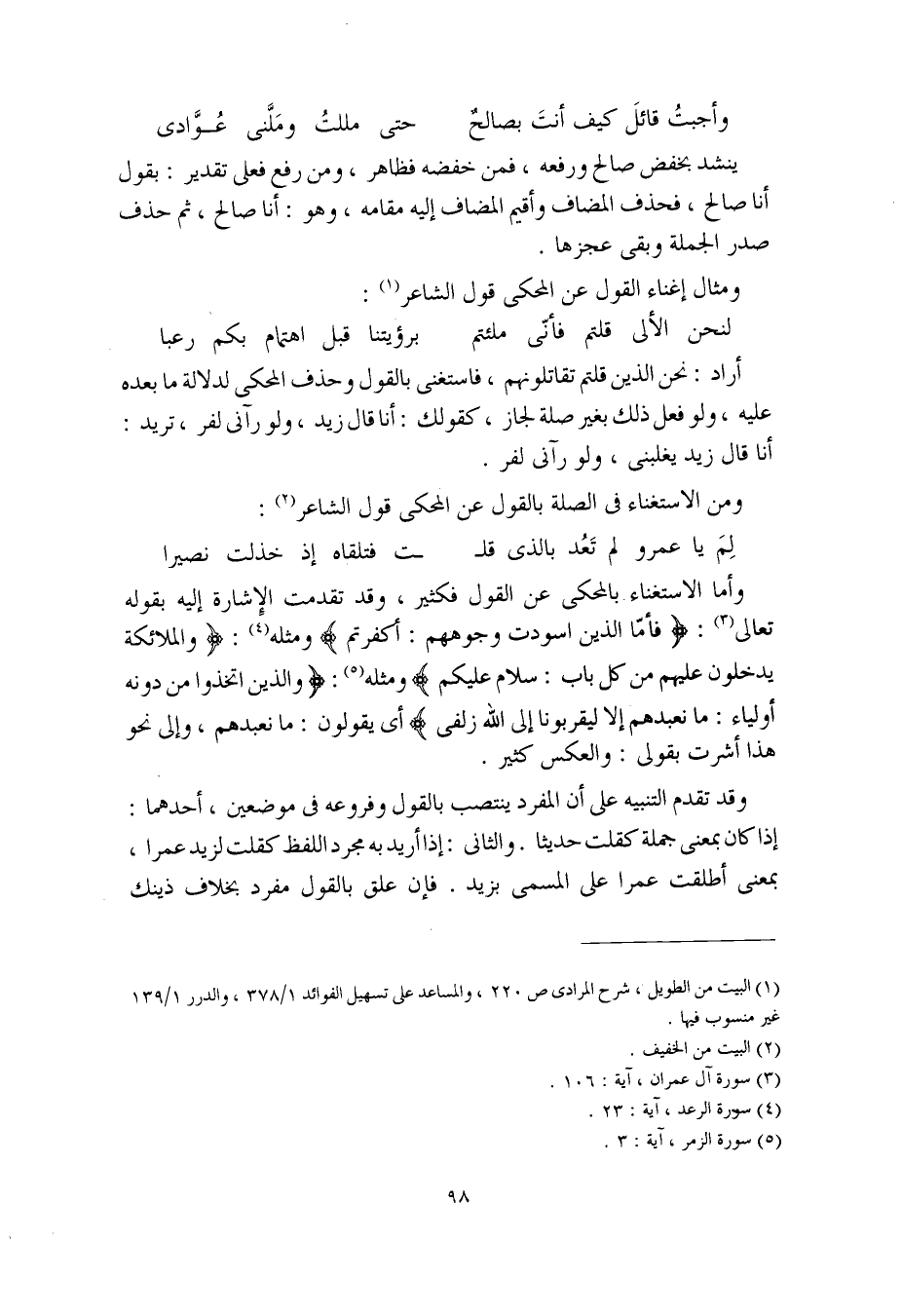 وأما الاستغناء بالمحكي عن القول فكثير، وقد تقدمت الإشارة إليه بقوله تعالى: (فأمّا الذين اسودت وجوههم: أكفرتم) ومثله: (والملائكة يدخلون عليهم من كل باب: سلام عليكم) ومثله: (والذين اتخذوا من دونه أولياء: ما نعبدهم إلا ليقربونا إلى الله زلفى) أي يقولون: ما نعبدهم، وإلى نحو هذا أشرت بقولي: والعكس كثير.