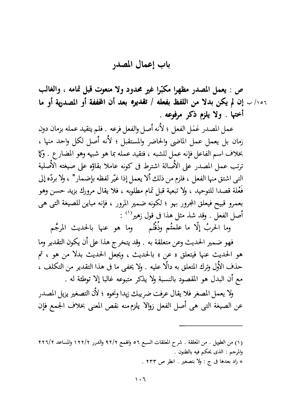 ص: يعمل المصدر مظهرا مكبّرا غير محدود ولا منعوت قبل تمامه، والغالب إن لم يكن بدلا من اللفظ بفعله تقديره بعد أن المخففة أو المصدرية أو ما أختها. ولا يلزم ذكر مرفوعه.
