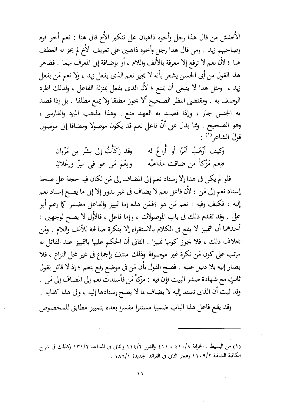الأخفش من قال هذا رجل وأخوه ذاهبان على تنكير الأخ قال هنا: نعم أخو قوم وصاحبهم زيد. ومن قال هذا رجل وأخوه ذاهبين على تعريف الأخ لم يجز له العطف هنا، لأن نعم لا ترفع إلا معرفة بالألف واللام، أو بإضافة إلى المعرف بهما. فظاهر هذا القول من أبي الحسن يشعر بأنه لا يجيز نعم الذي يفعل زيد، ولا نعم مَن يفعل زيد، ومثل هذا لا ينبغي أن يمنع، لأن الذي يفعل بمنزلة الفاعل، ولذلك اطرد الوصف به. ومقتضى النظر الصحيح ألا يجوز مطلقا ولا يمنع مطلقا. بل إذا قصد به الجنس جاز، وإذا قصد به العهد منع. وهذا مذهب المبرد والفارسي، وهو الصحيح. ومما يدل على أنّ فاعل نعم قد يكون موصولا ومضافا إلى موصول قول الشاعر: