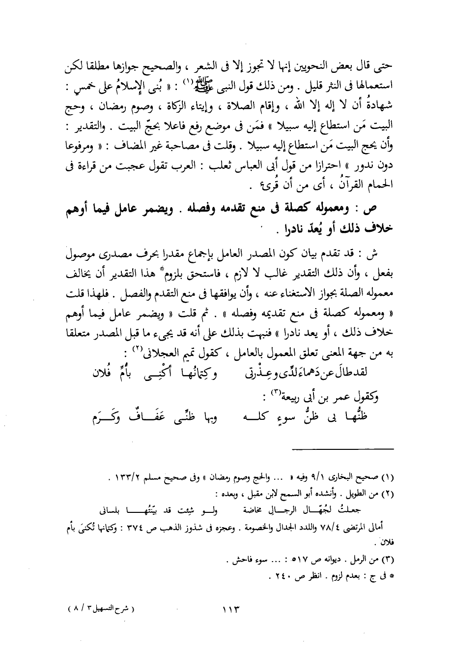 حتى قال بعض النحويين إنها لا تجوز إلا في الشعر، والصحيح جوازها مطلقا لكن استعمالها في النثر قليل. ومن ذلك قول النبي صلى الله عليه وسلم: "بُني الإسلام على خمس: شهادةُ أن لا إله إلا الله، وإقام الصلاة، وإيتاء الزكاة، وصوم رمضان، وحج البيت من استطاع إليه سبيلا" فمَن في موضع رفع فاعلا بحجّ البيت. والتقدير: وأن يحج البيتَ من استطاع إليه سبيلا. وقلت في مصاحبة غير المضاف: "ومرفوعا دون ندور" احترازا من قول أبي العباس ثعلب: العرب تقول عجبت من قراءة في الحمام القرآنُ، أي من أن قُرئ.