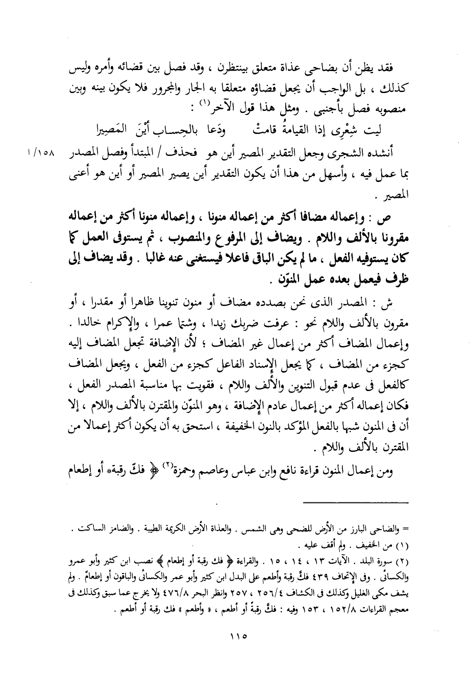 ش: المصدر الذي نحن بصدده مضاف أو منون تنوينا ظاهرا أو مقدرا، أو مقرون بالألف واللام نحو: عرفت ضربك زيدا، وشتما عمرا، والإكرام خالدا. وإعمال المضاف أكثر من إعمال غير المضاف، لأن الغضافة تجعل المضاف إليه كجزء من المضاف، كما يجعل الإسناد الفاعل كجزء من الفعل، ويجعل المضاف كالفعل في عدم قبول التنوين والألف واللام، فقويت بها مناسبة المصدر الفعل، فكان إعماله أكثر من إعمال عادم الإضافة، وهو المنوّن والمقترن بالألف واللام، إلا أن في المنون شبها بالفعل المؤكد بالنون الخفيفة، استحق به أن يكون أكثر إعمالا من المقترن بالألف واللام.