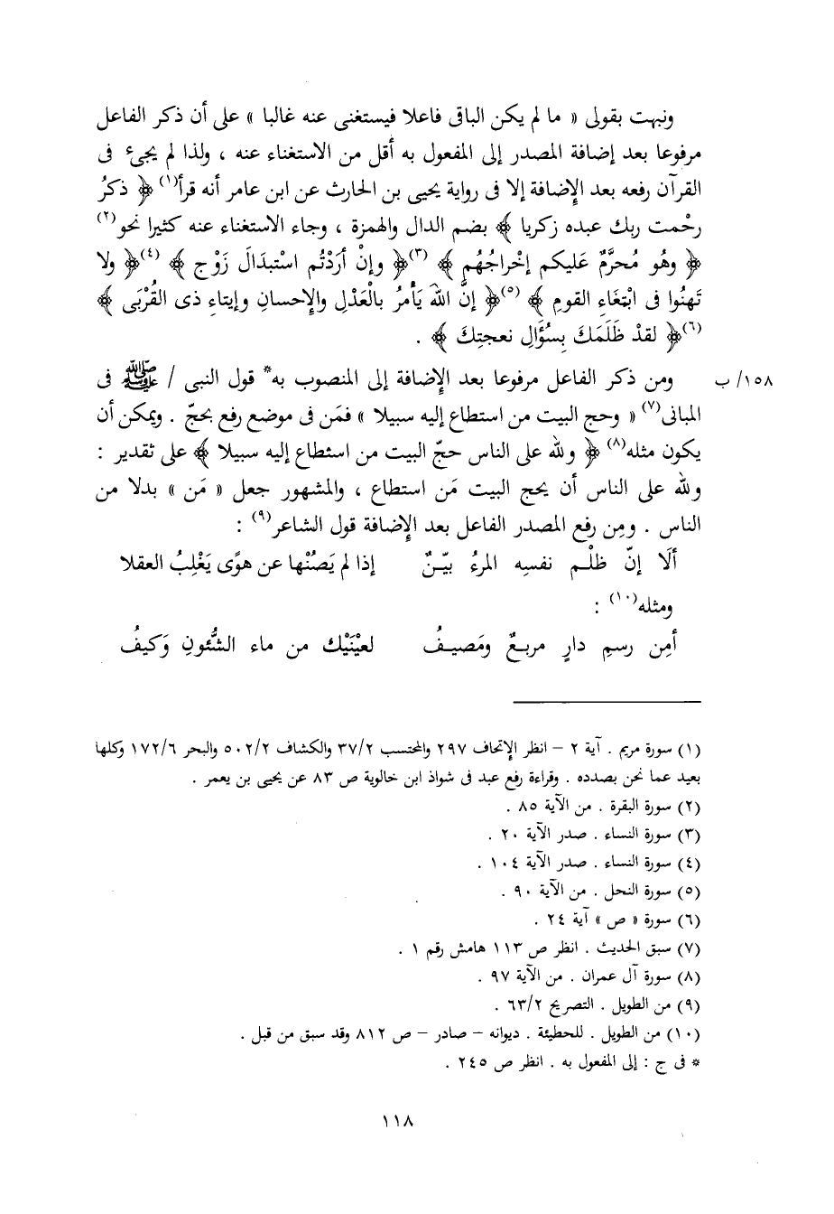 ونبهت بقولي "ما لم يكن الباقي فاعلا فيستغنى عنه غالبا" على أن ذكر الفاعل مرفوعا بعد إضافة المصدر إلى المفعول به أقل من الاستغناء عنه، ولذا لم يجئ في القرآن رفعه بعد الإضافة إلا في رواية يحيى بن الحارث عن ابن عامر أنه قرأ (ذكرُ رحمت ربك عبده زكريا) بضم الدال والهمزة، وجاء الاستغناء عنه كثيرا نحو (وهو مُحرَّمٌ عليكم إخراجُهم) (وإنْ أردتم استبدال زوج) (ولا تَهنوا في ابتغاء القوم) (إنّ الله يأمر بالعدل والإحسان وإيتاء ذي القربى) (لقد ظلمك بسؤال نعجتك).
