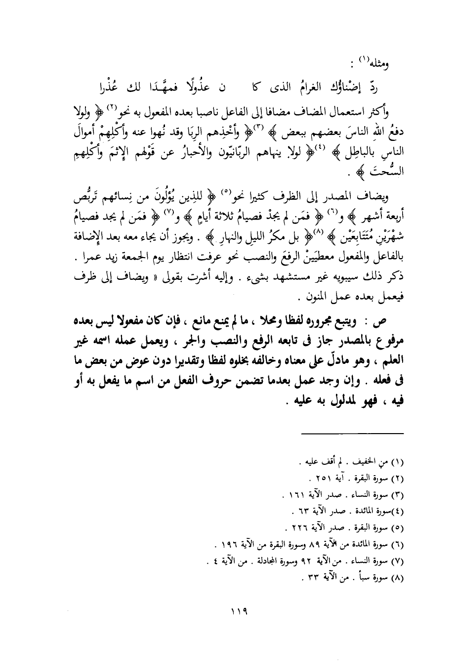 وأكثر استعمال المضاف مضافا إلى الفاعل ناصبا بعده المفعول به نحو (ولولا دفعُ الله الناسَ بعضهم ببعض) (وأخذِهم الربا وقد نُهوا عنه وأكلِهم أموالَ الناسِ بالباطل) (لولا ينهاهم الرّبّانيّون والأحبارُ عن قولهم الإثمَ وأكلهم السُّحتَ).