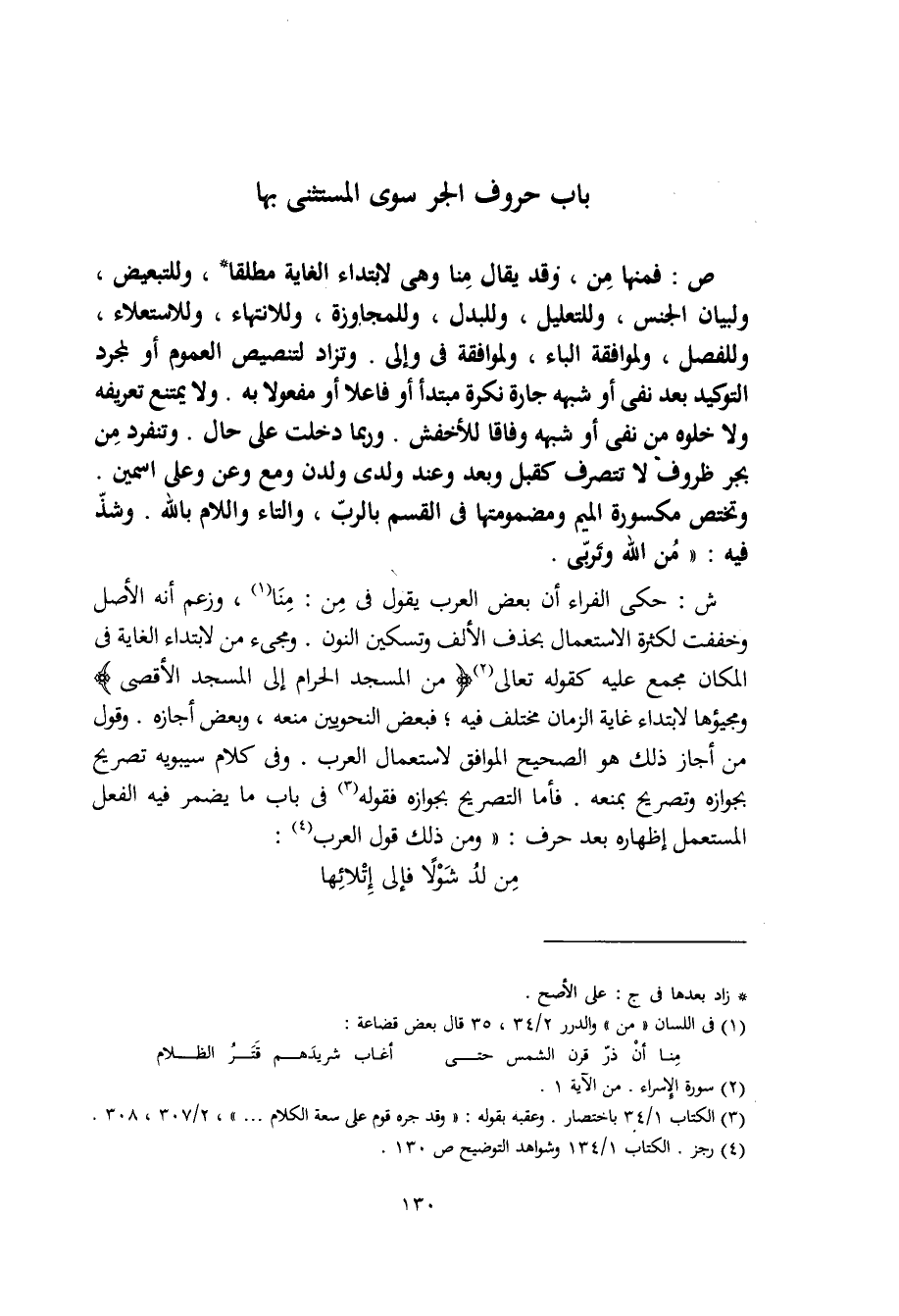 ش: حكى الفراء أن بعض العرب يقول في من: مِنا، وزعم أنه الأصل وخففت لكثرة الاستعمال بحذف الألف وتسكين النون. ومجيء من لابتداء الغاية في المكان مجمع عليه كقوله تعالى (من المسجد الحرام إلى المسجد الأقصى) ومجيؤها لابتداء غاية الزمان مختلف فيه؛ فبعض النحويين منعه، وبعض أجازه. وقول من أجاز ذلك هو الصحيح الموافق لاستعمال العرب. وفي كلام سيبويه تصريح بجوازه وتصريح بمنعه. فأما التصريح بجوازه فقوله في باب ما يضمر فيه الفعل المستعمل إظهاره بعد حرف: "ومن ذلك قول العرب:
