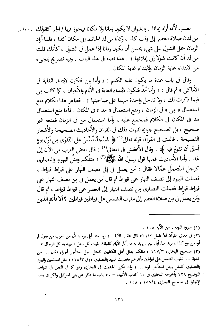 وقال في باب عدة ما يكون عليه الكلم: "وأما مِن فتكون لابتداء الغاية في الأماكن" ثم قال: "وأما مُذْ فتكون لابتداء الغاية في الأيام والأحيان، كما كانت مِن فيما ذكرت لك، ولا تدخل واحدة منهما على صاحبتها". فظاهر هذا الكلام منع استعمال "مِن" في الزمان، ومنع استعمال "مذ" في المكان. فأما منع استعمال مذ في المكان في الكلام فمجمع عليه، وأما استعمال من في الزمان فمنعه غير صحيح، بل الصحيح جوازه لثبوت ذلك في القرآن والأحاديث الصحيحة والأشعار الفصيحة، فالذي في القرآن قوله تعالى (لمسجدٌ أُسِّسَ على التّقوى من أوّل يومٍ أحقُ أن تقومَ فيه). وقال الأخفش في المعاني: قال بعض العرب من الآن إلى غد. وأما الأحاديث فمنها قول رسول الله صلى الله عليه وسلم: "مثلُكم ومثلُ اليهودِ والنصارى كرجل استعمال عمّالا فقال: مَن يعمل لي إلى نصف النهار على قيراط قيراط، فعملت اليهود إلى نصف النهار على قيراط ثم قال مَن يعمل لي مِن نصف النهار على قيراط قيراط فعملت النصارى مِن نصف النهار إلى العصر على قيراط قيراط، ثم قال ومَن يعملُ لي من صلاة العصر إلى مغرب الشمس على قيراطين قيراطين؟ ألا فأنتم الذين