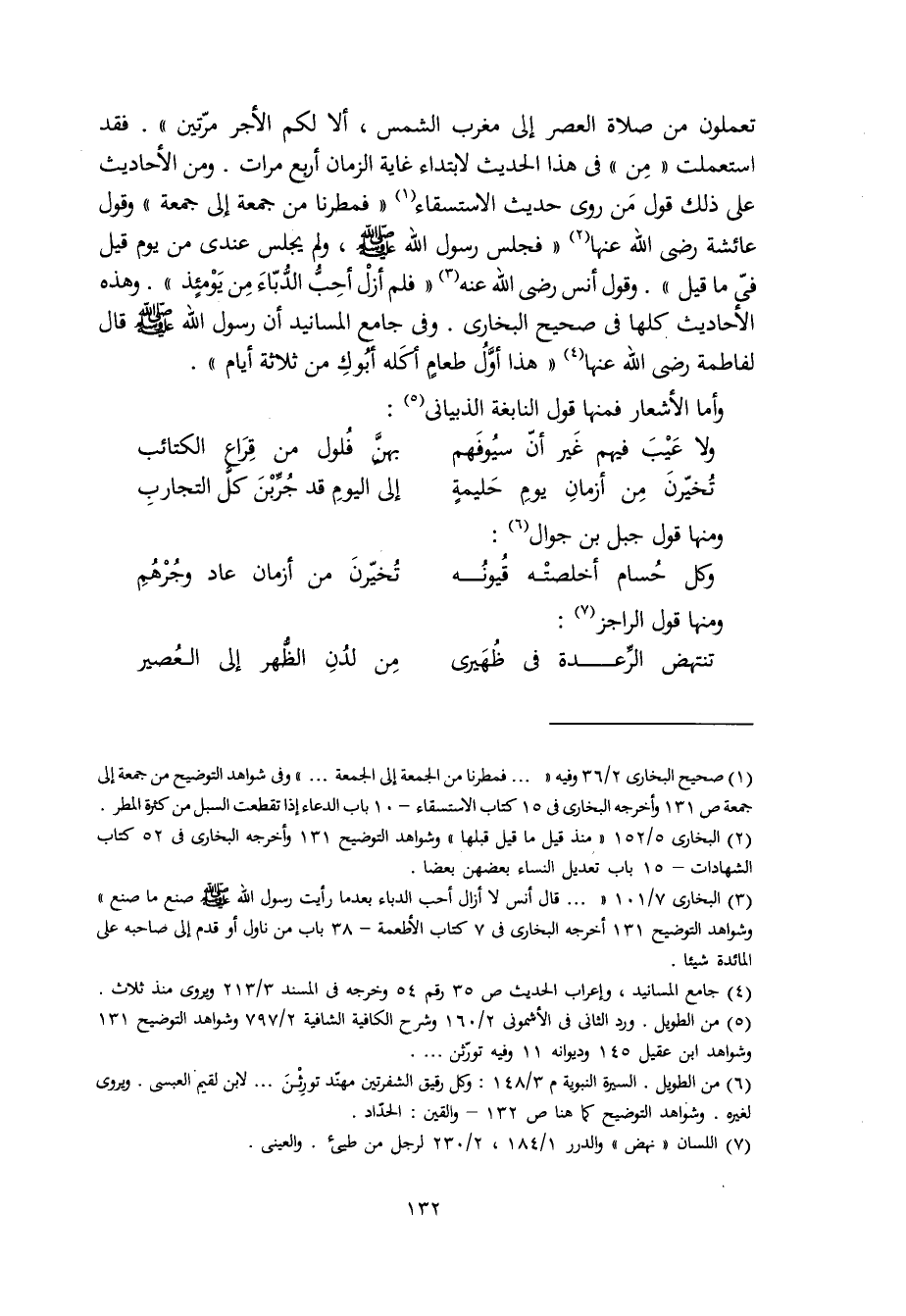 تعملون من صلاة العصر إلى مغرب الشمس، ألا لكم الأجر مرّتين". فقد استعملت "مِن" في هذا الحديث لابتداء غاية الزمان أربع مرات. ومن الأحاديث على ذلك قول مَن روى حديث الاستسقاء "فمطرنا من جمعة إلى جمعة" وقول عائشة رضي الله عنها "فجلس رسول الله صلى الله عليه وسلم، ولم يجلس عندي من يوم قيل فيّ ما قيل". وقول أنس رضي الله عنه "فلمْ أزلْ أحِبُّ الدُّبّاء من يومئذ". وهذه الأحاديث كلها في صحيح البخاري. وفي جامع المسانيد أن رسول الله صلى الله عليه وسلم قال لفاطمة رضي الله عنها "هذا أوّلُ طعامٍ أكله أبوكِ من ثلاثة أيام".