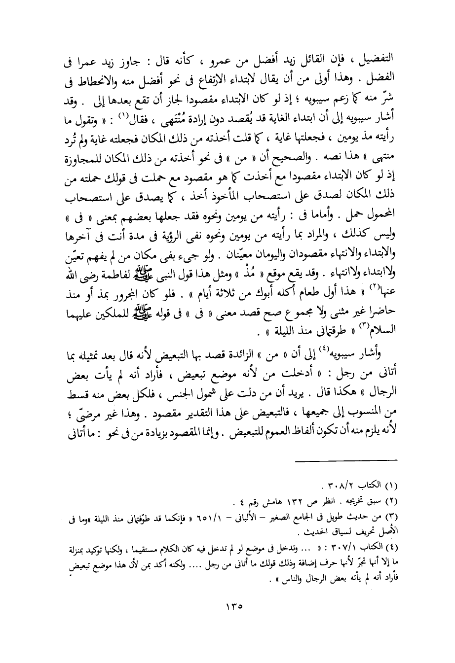 التفضيل، فإن القائل زيد أفضل من عمرو، كأنه قال: جاوز زيد عمرا في الفضل. وهذا أولى من أن يقال لابتداء الارتفاع في نحو أفضل منه والانحطاط في شرّ منه كما زعم سيبويه؛ إذ لو كان الابتداء مقصودا لجاز أن تقع بعدها إلى. وقد أشار سيبويه إلى أن ابتداء الغاية قد يُقصد دون إرادة مُنْتَهى، فقال: "وتقول ما رأيته مذ يومين، فجعلتها غاية، كما قلت أخذته من ذلك المكان فجعلته غاية ولم تُرد منتهى" هذا نصه. والصحيح أن "من" في نحو أخذته من ذلك المكان للمجاوزة إذ لو كان الابتداء مقصودا مع أخذت كما هو مقصود مع حملت في قولك حملته من ذلك المكان لصدق على استصحاب المأخوذ أخذ، كما يصدق على استصحاب المحمول حمل. وأماما في: رأيته من يومين ونحوه فقد جعلها بعضهم بمعنى "في" وليس كذلك، والمراد بما رأيته من يومين ونحوه نفي الرؤية في مدة أنت في آخرها والابتداء والانتهاء مقصودان واليومان معيّنان. ولو جيء بفي مكان من لم يفهم تعيّن ولا ابتداء ولا انتهاء. وقد يقع موقع "مُذْ" ومثل هذا قول النبي صلى الله عليه وسلم لفاطمة رضي الله عنها "هذا أول طعام أكله أبوك من ثلاثة أيام". فلو كان المجرور بمذ أو منذ حاضرا غير مثنى ولا مجموع صح قصد معنى "في" في قوله صلى الله عليه وسلم للملكين عليهما السلام "طرقتماني منذ الليلة".