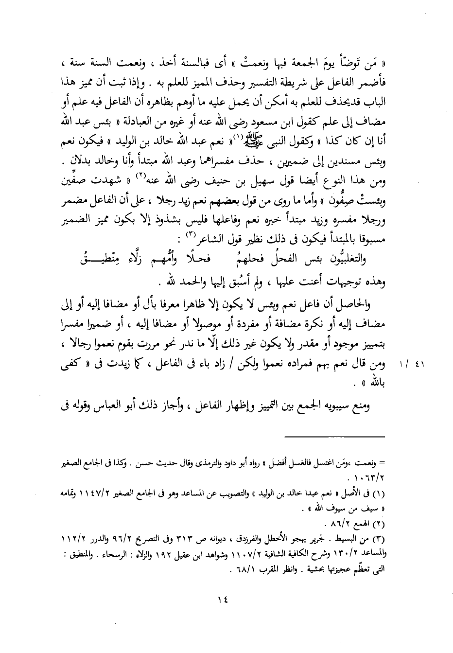 "مَن توضّأ يومَ الجمعة فبها ونعمتْ" أي فبالسنة أخذ، ونعمت السنة سنة، فأضمر الفاعل على شريطة التفسير وحذف المميز للعلم به. وإذا ثبت أن مميز هذا الباب قد يحذف للعلم به أمكن أن يحمل عليه ما أوهم بظاهره أن الفاعل فيه علم أو مضاف إلى علم كقول ابن مسعود رضي الله عنه أو غيره من العبادلة "بئس عبد الله أنا إن كان كذا" وكقول النبي صلى الله عليه وسلم "نعم عبد الله خالد بن الوليد" فيكون نعم وبئس مسندين إلى ضميرين، حذف مفسراهما وعبد الله مبتدأ وأنا وخالد بدلان. ومن هذا النوع أيضا قول سهيل بن حنيف رضي الله عنه "شهدت صفّين وبئست صِفُّون" وأما ما روي من قول بعضهم نعم زيد رجلا، على أن الفاعل مضمر ورجلا مفسره وزيد مبتدأ خبره نعم وفاعلها فليس بشذوذ إلا بكون مميز الضمير مسبوقا بالمبتدأ فيكون في ذلك نظير قول الشاعر: