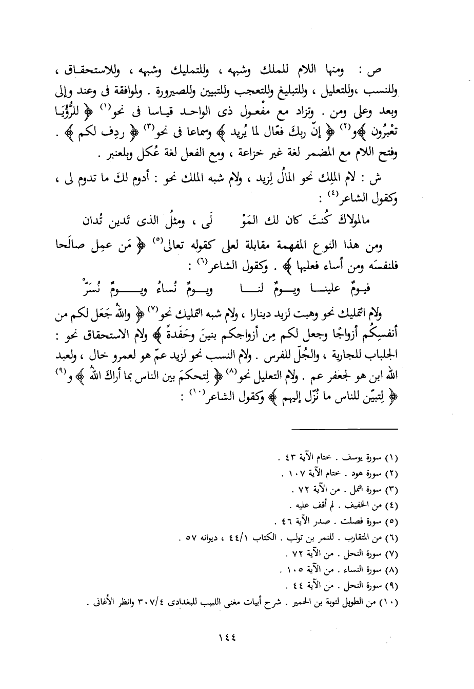 ولام التمليك نحو وهبت لزيد دينارا، ولام شبه التمليك نحو (واللهُ جعل لكم من أنفسكم أزواجًا وجعل لكم من أزواجكم بنين وحفدةً) ولام الاستحقاق نحو: الجلباب للجارية، والجُلّ للفرس. ولام النسب نحو لزيد عمّ هو لعمرو خال، ولعبد الله ابن هو لجعفر عم. ولام التعليل نحو (لِتحكمَ بين الناس بما أراك اللهُ) و (لتبيّن للناس ما نُزّل إليهم) وكقول الشاعر: