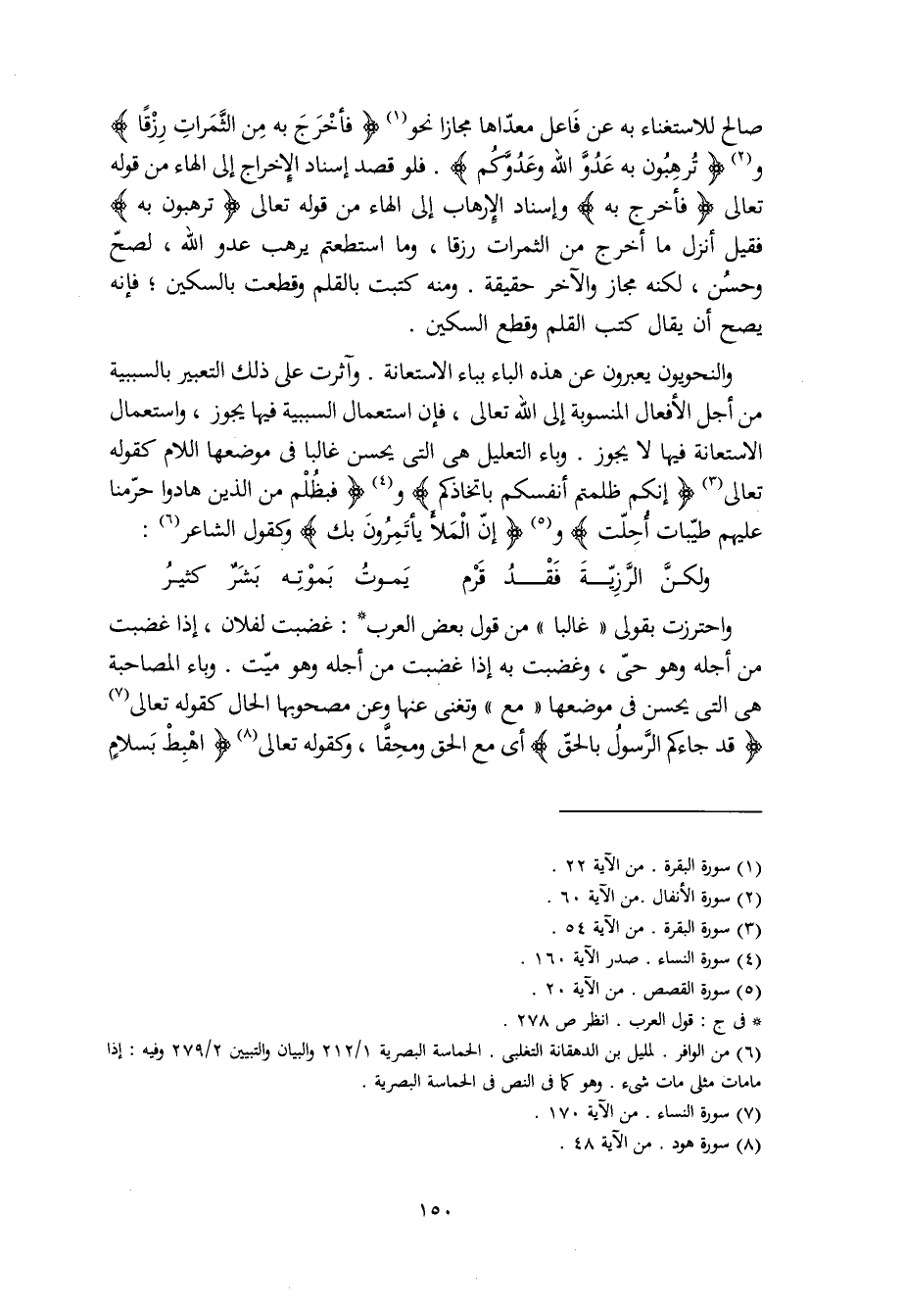 واحترزت بقولي "غالبا" من قول بعض العرب: غضبت لفلان، إذا غضبت من أجله وهو حيّ، وغضبت به إذا غضبت من أجله وهو ميّت. وباء المصاحبة هي التي يحسن في موضعها "مع" وتغني عنها وعن مصحوبها الحال كقوله تعالى (قد جاءكم الرَّسولُ بالحقّ) أي مع الحق ومحِقًّا، وكقوله تعالى (اهْبِط بسلامٍ