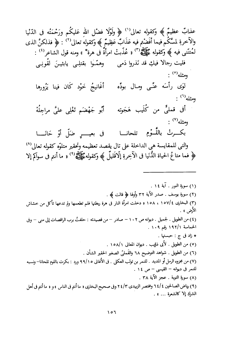 عذابٌ عظيمٌ) وكقوله تعالى (ولولا فضل الله عليكم ورحمته في الدّنيا والآخرة لمسَّكم فيما أفضتم فيه عذابٌ عظيم) وكقوله تعالى: (فذلكنَّ الذي لُمتنّني فيه) وكقوله صلى الله عليه وسلم "عُذّبت امرأةٌ في هرة" ومنه قول الشاعر: