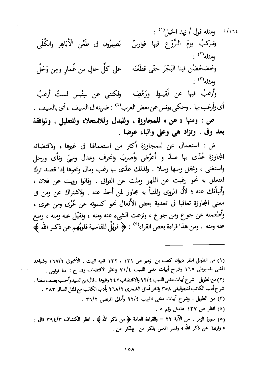 ش: استعمال عن للمجاوزة أكثر من استعمالها في غيرها، ولاقتضائه المجاوزة عُدّي بها صدّ وأعرض وأضربَ وانحرف وعدل ونهى ونأى ورحل واستغنى، وغفل وسها وسلا. ولذلك عدّي بها رغب ومال ونحوها إذا قصد ترك المتعلق به نحو رغبت عن اللهو وملت عن التواني. وقالوا رويت عن فلان، وأنبأتك عنه، لأن المروي والمنبأ به مجاوز لمن أخذ عنه، ولاشتراك عن ومن في معنى المجاوزة تعاقبا في تعدية بعض الأفعال نحو كسوته عن عُرْي ومن عري، وأطعمته عن جوع ومن جوع، ونزعت الشيء عنه ومنه، وتقبّل عنه ومنه، ومنع عنه ومنه. ومن هذا قراءة بعض القراء: (فويلٌ للقاسية قلوبهم عن ذكر الله)