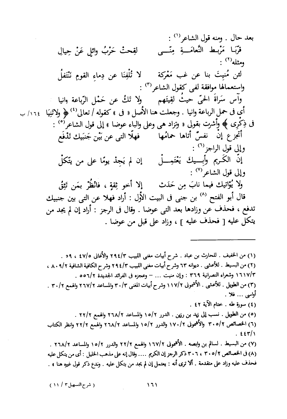 قال أبو الفتح بن جني في البيت الأول: أراد فهلا عن التي بين جنبيك تدفع، فحذف عن وزادها بعد التي عوضا. وقال في الرجز: أراد إن لم يجد من يتكل عليه [فحذف عليه]، وزاد على قبل من عوضا.