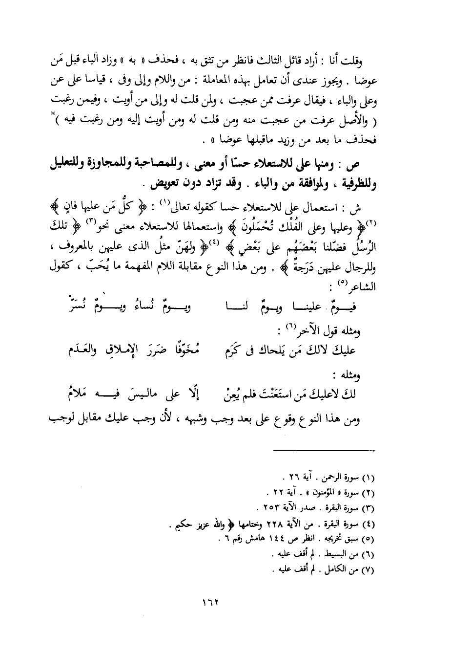 ش: استعمال على للاستعلاء حسا كقوله تعالى: (كلُّ مَن عليها فانٍ) (وعليها وعلى الفُلْك تُحْمَلون) واستعمالها للاستعلاء معنى نحو (تلك الرُسلُ فضّلنا بعضهم على بعض) (ولهنّ مثلُ الذي عليهن بالمعروف، وللرجال عليهن درجةٌ). ومن هذا النوع مقابلة اللام المفهمة ما يُحَبّ، كقول الشاعر: