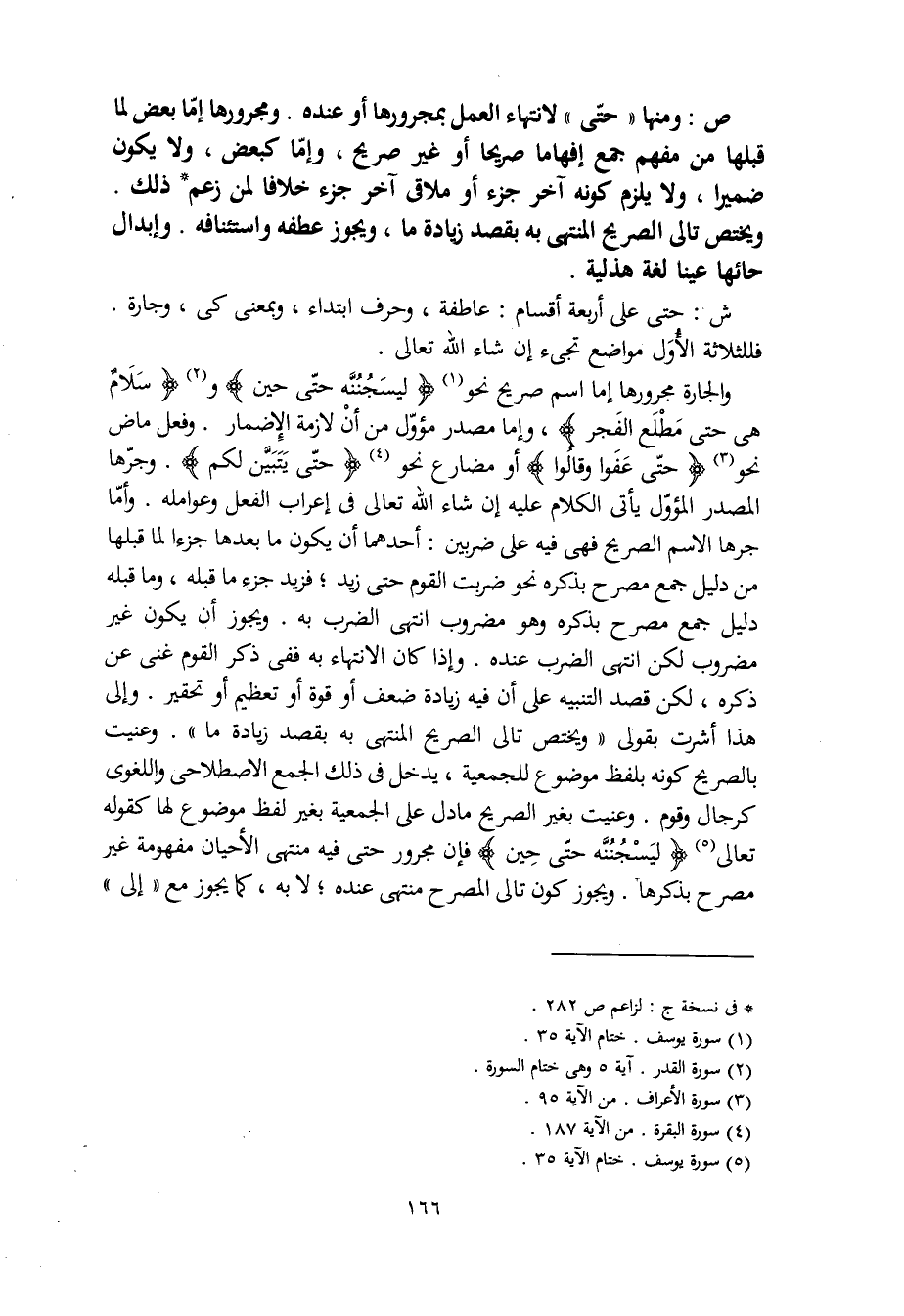ش: حتى على أربعة أقسام: عاطفة، وحرف ابتداء، وبمعنى كي، وجارة. فللثلاثة الأُوَل مواضع تجيء إن شاء الله تعالى.