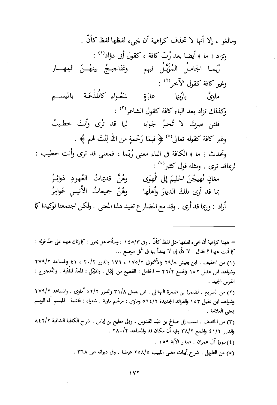 وتحدث "ما" الكافة في الباء معنى رُبّما، فمعنى قد ترى وأنت خطيب: لربما قد ترى. ومثله قول كثير:
