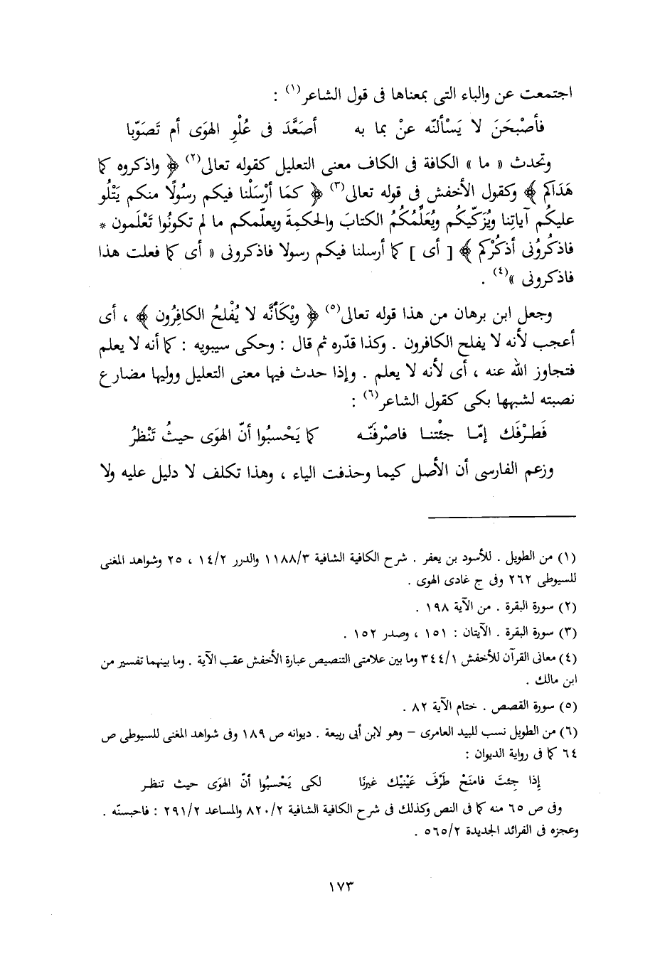 وتحدث "ما" الكافة في الكاف معنى التعليل كقوله تعالى (واذكروه كما هداكم) وكقول الأخفش في قوله تعالى (كما أرسلنا فيكم رسولًا منكم يتلو عليكم آياتنا ويُزَكِّيكم ويُعلّمكم الكتابَ والحكمة ويعلّمكم مالم تكونوا تعلمون * فاذكروني أذكركم) [أي] كما أرسلنا فيكم رسولا فاذكروني "أي كما فعلت هذا فاذكروني".