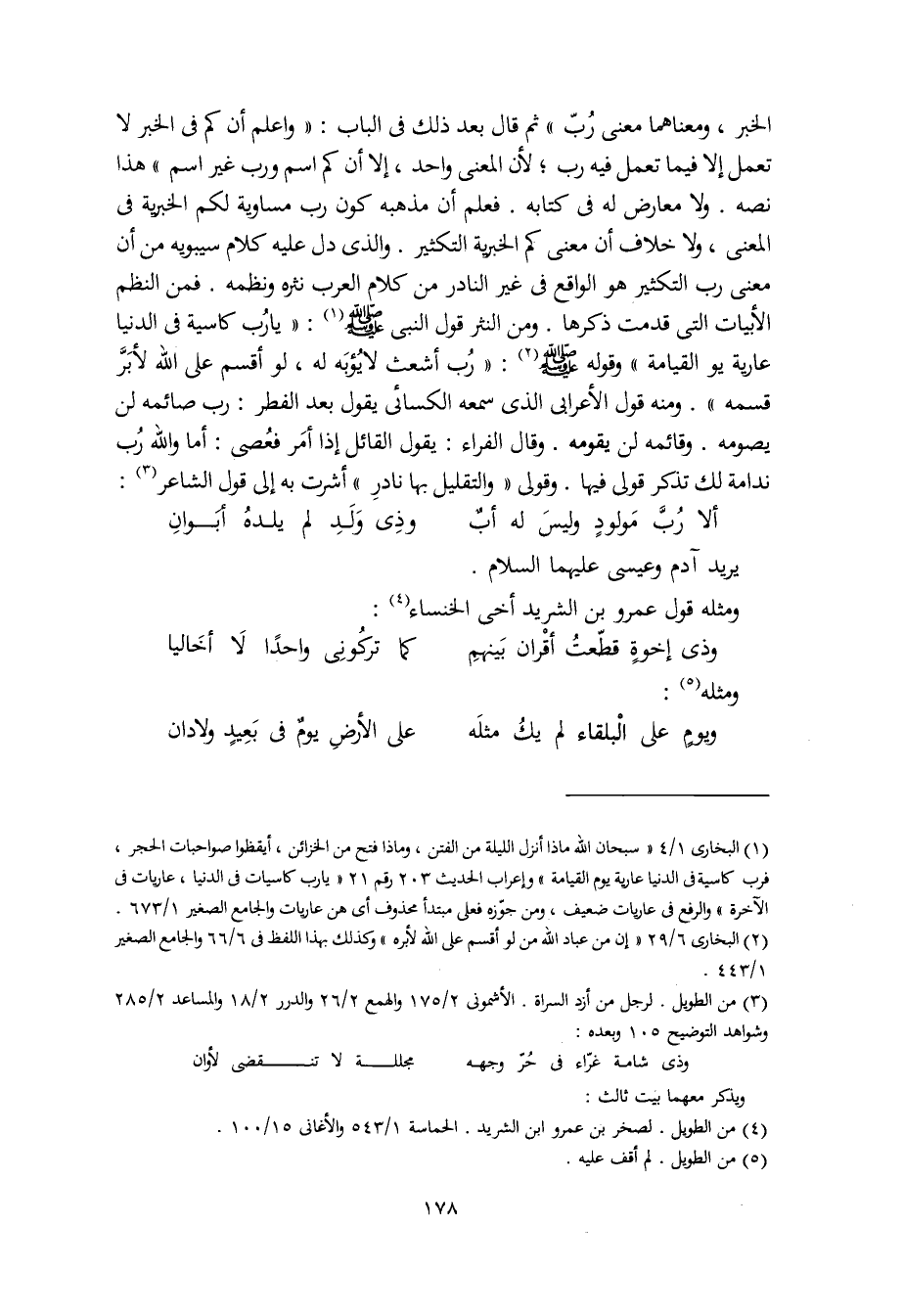 الخبر، ومعناهما معنى رُبّ" ثم قال بعد ذلك في الباب: "واعلم أن كم في الخبر لا تعمل إلا فيما تعمل فيه رب، لأن المعنى واحد، إلا أن كم اسم ورب غير اسم" هذا نصه. ولا معارض له في كتابه. فعلم أن مذهبه كون رب مساوية لكم الخبرية في المعنى، ولا خلاف أن معنى كم الخبرية التكثير. والذي دل عليه كلام سيبويه من أن معنى رب التكثير هو الواقع في غير النادر من كلام العرب نثره ونظمه. فمن النظم الأبيات التي قدمت ذكرها. ومن النثر قول النبي صلى الله عليه وسلم: "يارُب كاسية في الدنيا عارية يوم القيامة" وقوله صلى الله عليه وسلم: "رُب أشعث لا يُؤبَه له، لو أقسم على الله لأبَرَّ قسمه". ومنه قول الأعرابي الذي سمعه الكسائي يقول بعد الفطر: رب صائمه لن يصومه، وقائمه لن يقومه. وقال الفراء: يقول القائل إذا أمَر فعُصي: أما والله رُب ندامة لك تذكر قولي فيها. وقولي "والتقليل بها نادر" أشرت به إلى قول الشاعر: