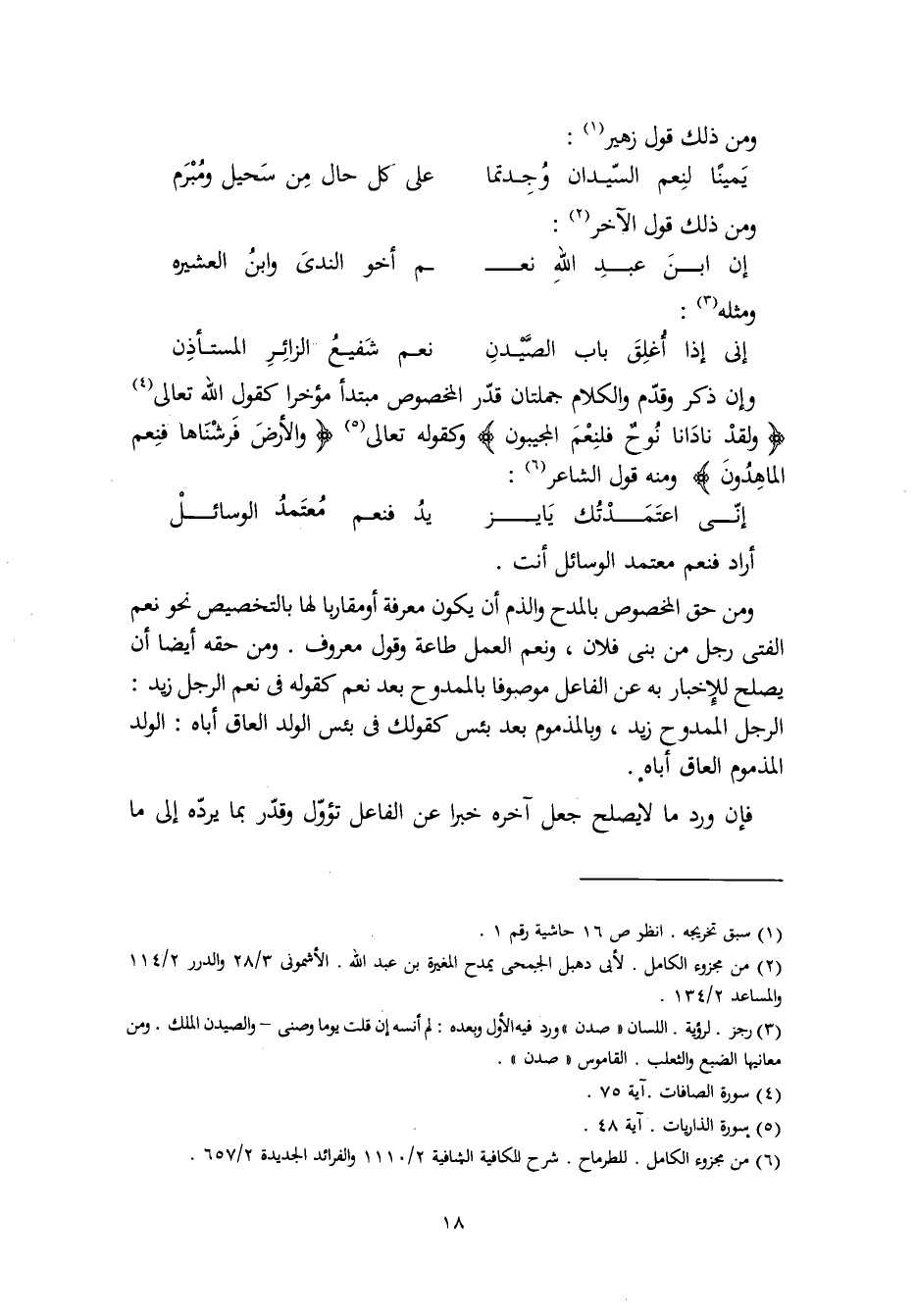 وإن ذكر وقدّم والكلام جملتان قدّر المخصوص مبتدأ مؤخرا كقول الله تعالى (ولقد نادانا نوحٌ فلنِعْمَ المجيبون) وكقوله تعالى (والأرضَ فَرشْناها فنِعم الماهِدون) ومنه قول الشاعر: