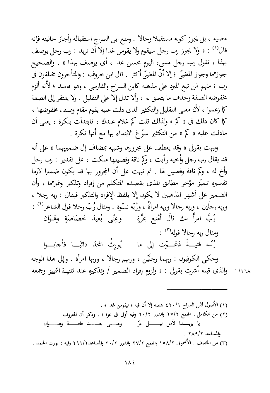 مضيه، بل يجوز كونه مستقبلا وحالا. ومنع ابن السراج استقباله وأجاز حاليته فإنه قال: "ولا يجوز رب رجل سيقوم ولا يقومن غدا إلا أن تريد: رب رجل يوصف بهذا، تقول رب رجل مسيء اليوم محسن غدا، أي يوصف بهذا". والصحيح جوازهما وجواز المضيّ، إلا أنّ المضيّ أكثر. قال ابن خروف: والمتأخرون مختلفون في رب؛ منهم مَن تبع المبرد على مذهبه كابن السراج والفارسي، وهو فاسد، لأنه ألزم مخفوضة الصفة وحذف ما يتعلق به، وألا تدل إلا على التقليل. ولا يفتقر إلى الصفة كما زعموا، لأن معنى التقليل والتكثير الذي دلت عليه يقوم مقام وصف مخفوضها، كما كان ذلك في "كم" ولذلك قلت كم غلام عندك، فابتدأت بنكرة، يعني أن ما دلت عليه "كم" من التكثير سوّغ الابتداء بها مع أنها نكرة.