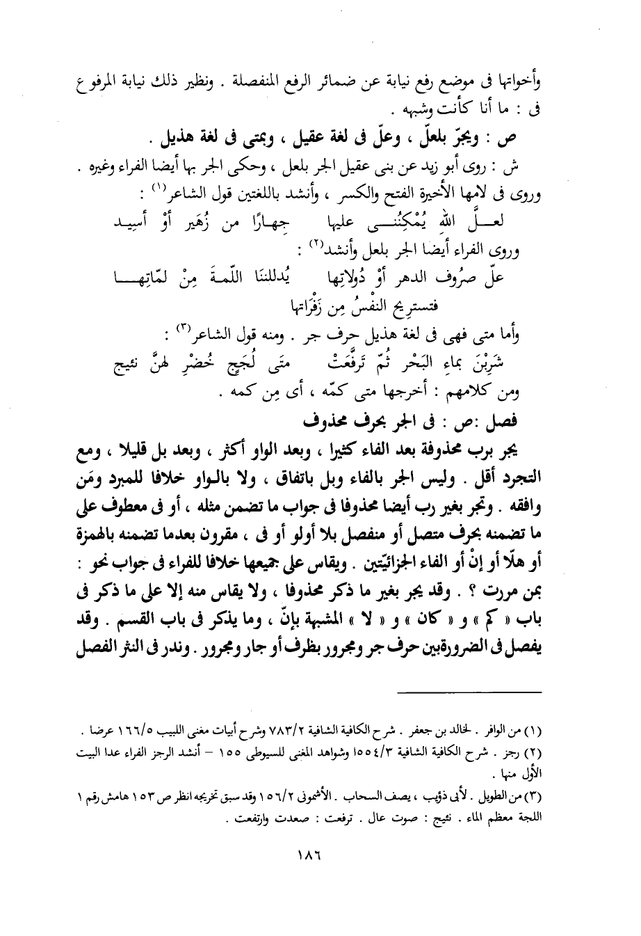 يجر برب محذوفة بعد الفاء كثيرا، وبعد الواو أكثر، وبعد بل قليلا، ومع التجرد أقل. وليس الجر بالفاء وبل باتفاق، ولا بالواو خلافا للمبرد ومَن وافقه. وتجر بغير رب أيضا محذوفا في جواب ما تضمن مثله، أو في معطوف على ما تضمنه بحرف متصل أو منفصل بلا أولو أو في، مقرون بعدما تضمنه بالهمزة أو هلّا أو إنْ أو الفاء الجزائيّتين. ويقاس على جميعها خلافا للفراء في جواب نحو: بمن مررت؟. وقد يجر بغير ما ذكر محذوفا، ولا يقاس منه إلا على ما ذكر في باب "كم" و"كان" و"لا" المشبهة بإنّ، وما يذكر في باب القسم. وقد يفصل في الضرورة بين حرف جر ومجرور بظرف أو جار ومجرور. وندر في النثر الفصل