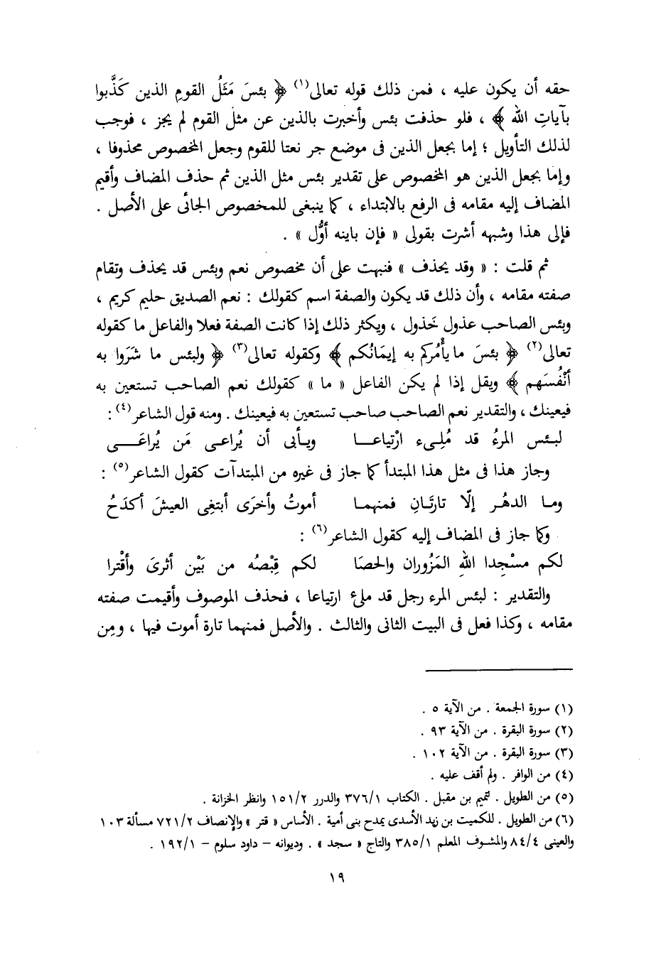 حقه أن يكون عليه، فمن ذلك قوله تعالى (بئس مثلُ القومِ الذين كَذَّبوا بآياتِ الله)، فلو حذفت بئس وأخبرت بالذين عن مثل القوم لم يجز، فوجب لذلك التأويل، إما يجعل الذين في موضع جر نعتا للقوم وجعل المخصوص محذوفا، وإما بجعل الذين هو المخصوص على تقدير بئس مثل الذين ثم حذف المضاف وأقيم المضاف إليه مقامه في الرفع بالابتداء، كما ينبغي للمخصوص الجائي على الأصل. فإلى هذا وشبهه أشرت بقولي "فإن باينه أوّل".