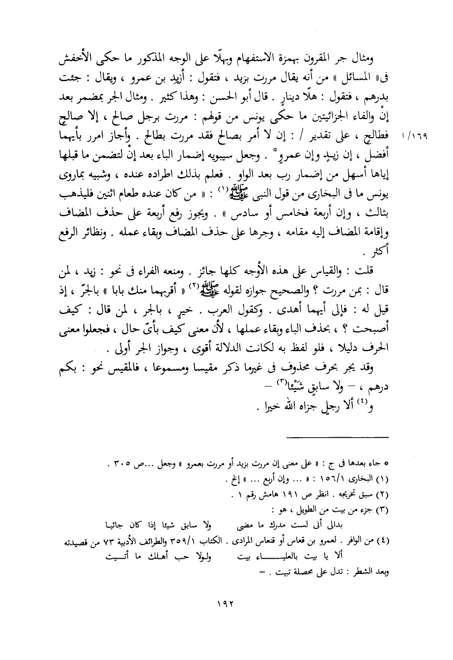 ومثال جر المقرون بهمزة الاستفهام وبهلّا على الوجه المذكور ما حكى الأخفش في "المسائل" من أنه يقال مررت بزيد، فتقول: أزيد بن عمرو، ويقال: جئت بدرهم، فتقول: هلّا دينارٍ. قال أبو الحسن: وهذا كثير. ومثال الجر بمضمر بعد إنْ والفاء الجزائيتين ما حكى يونس من قولهم: مررت برجل صالح، إلا صالحٍ فطالحٍ، على تقدير: إن لا أمر بصالح فقد مررت بطالح. وأجاز امرر بأيهما أفضل، إن زيدٍ وإن عمروٍ. وجعل سيبويه إضمار الباء بعد إنْ لتضمن ما قبلها إياها أسهل من إضمار رب بعد الواو. فعلم بذلك اطراده عنده، وشبيه بما روى يونس ما في البخاري من قول النبي صلى الله عليه وسلم: "من كان عنده طعام اثنين فليذهب بثالث، وإن أربعة فخامس أو سادس". ويجوز رفع أربعة على حذف المضاف وإقامة المضاف إليه مقامه، وجرها على حذف المضاف وبقاء عمله. ونظائر الرفع أكثر.
