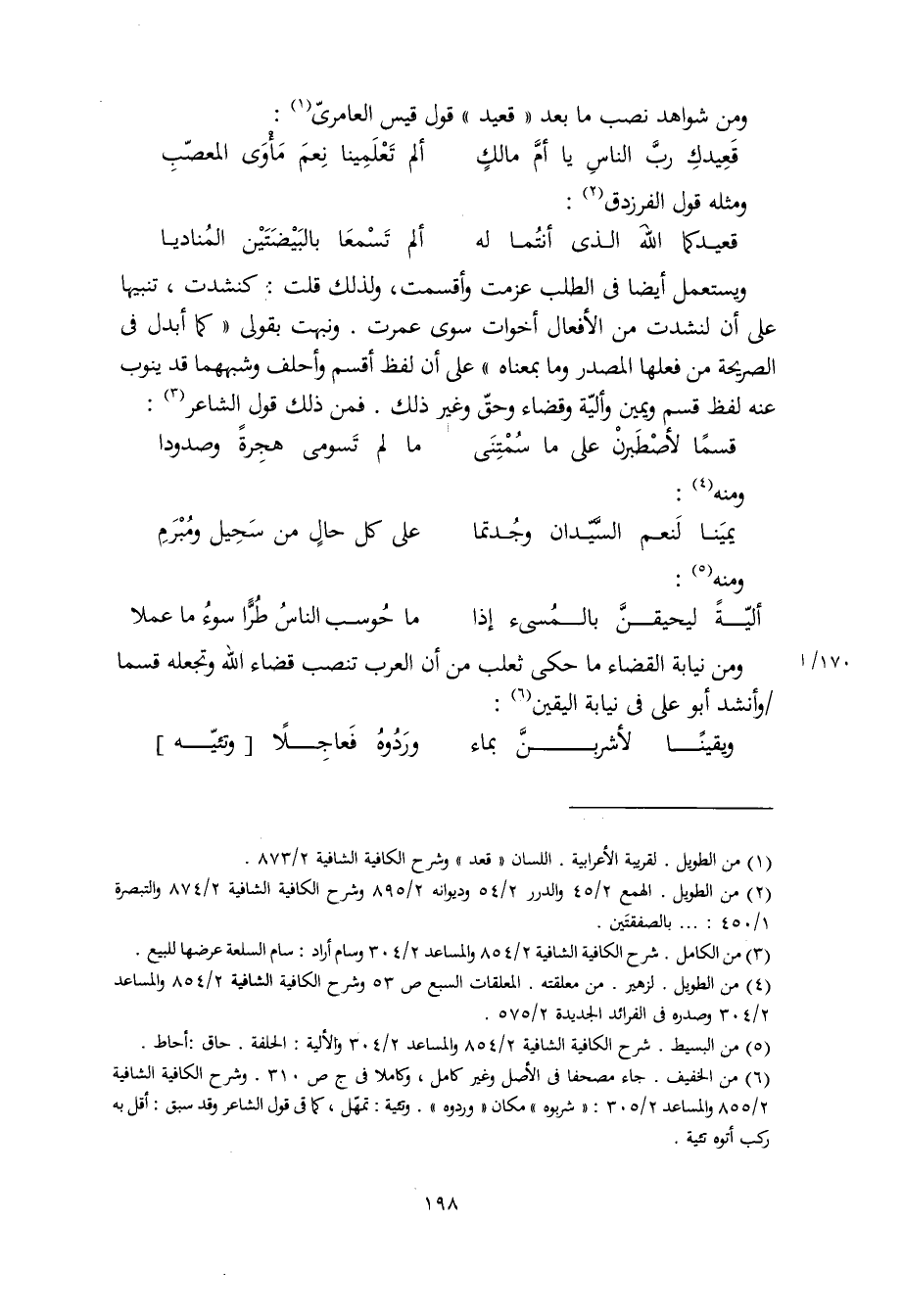 ويستعمل أيضا في الطلب عزمت وأقسمت، ولذلك قلت: كنشدت، تنبيها على أن لنشدت من الأفعال أخوات سوى عمرت. ونبهت بقولي "كما أبدل في الصريحة من فعلها المصدر وما بمعناه" على أن لفظ أقسم وأحلف وشبههما قد ينوب عنه لفظ قسم ويمين وأليّة وقضاء وحقّ وغير ذلك. فمن ذلك قول الشاعر: