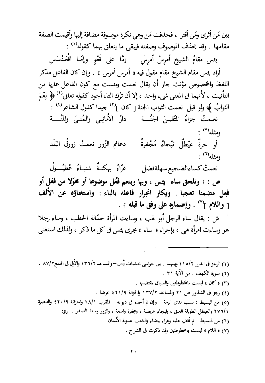 أراد بئس مقام الشيخ مقام مقول فيه "أمرس أمرس". وإن كان الفاعل مذكر اللفظ والمخصوص مؤنث جاز أن يقال نعمت وبئست مع كون الفاعل عاريا من التأنيث، لأنهما في المعنى شيء واحد، إلا أن ترْك التاء أجود كقوله تعالى: (نعم الثوابُ) ولو قيل نعمت الثواب الجنة [كان] جيدا كقول الشاعر: