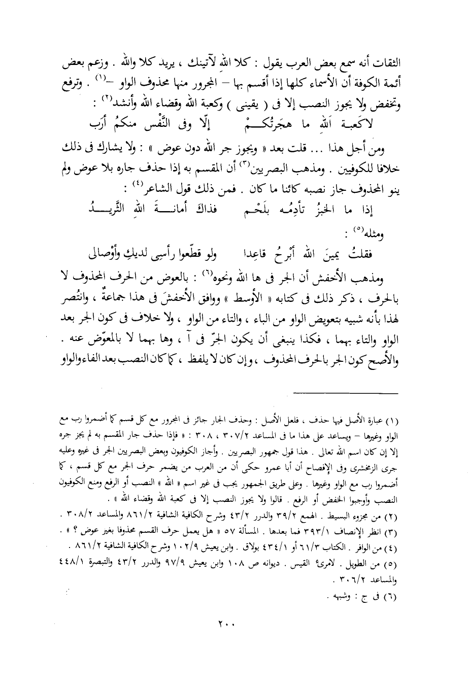 ومن أجل هذا ... قلت بعد "ويجوز جر الله دون عوض": ولا يشارك في ذلك خلافا للكوفيين. ومذهب البصريين أن المقسم به إذا حذف جاره بلا عوض ولم ينو المحذوف جاز نصبه كائنا ما كان. فمن ذلك قول الشاعر: