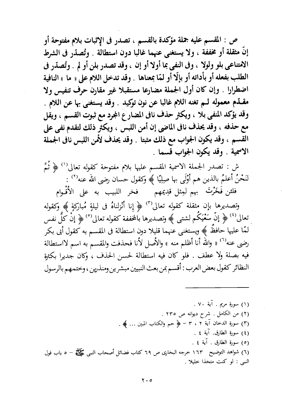ش: تصدر الجملة الاسمية المقسم عليها بلام مفتوحة كقوله تعالى (ثُمَّ لنَحْنُ أعلمُ بالذين هم أولى بها صِليّا) وكقول حسان رضي الله عنه:
